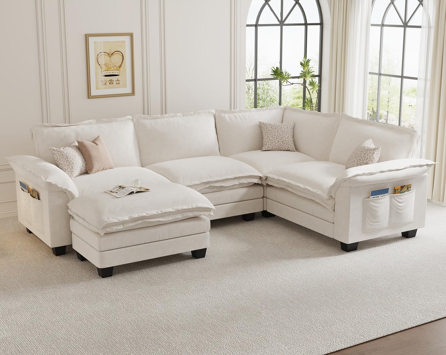 KKL J-Shaped Modular Sectional Sofa, 5 Seater Cloud Couch with Ottoman, Chenille Sectional Couches for Living Room, Apartment, Beige