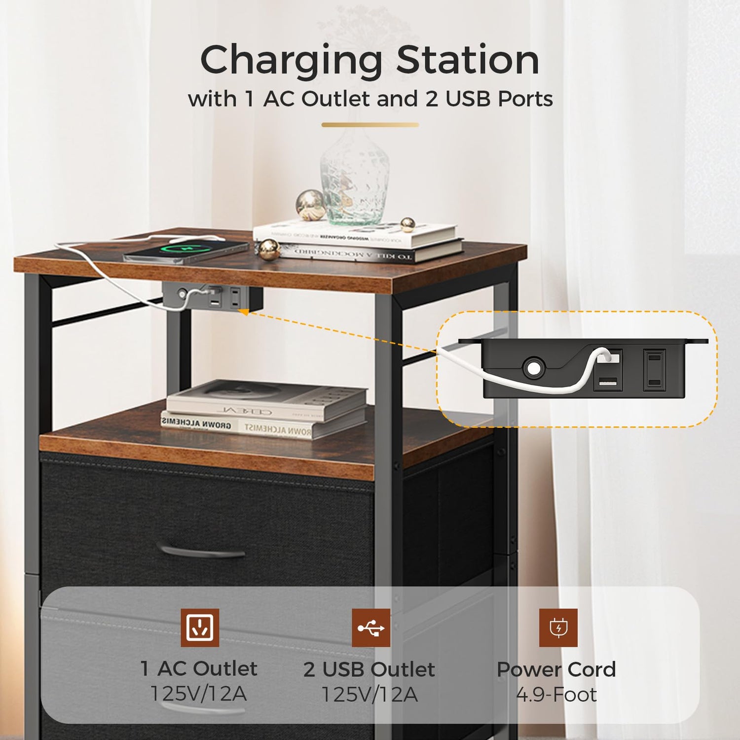 KKL Tall Nightstand with Charging Station and LED Lights, Bedside Table with Fabric Drawers, Open Shelves Storage for Bedroom, Black