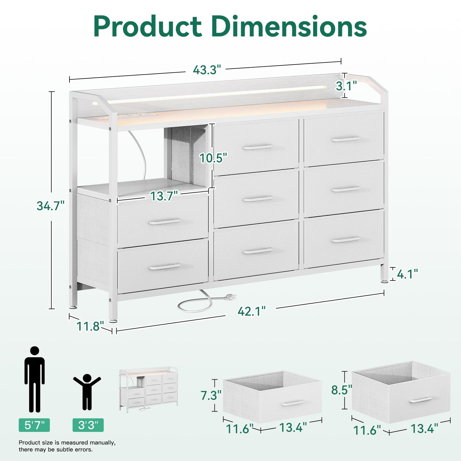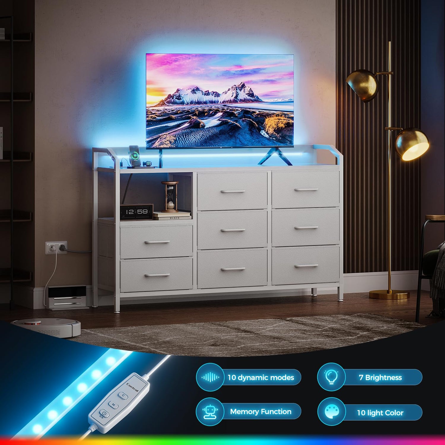 KKL White Dresser for Bedroom with Light Strip & Power Outlet — 8 Drawers Dressers & Chest of Drawers with Shelf, Wood Top, Metal Frame, Wide Dressers for Girls Bedroom, Living Room, Hallway, Closet