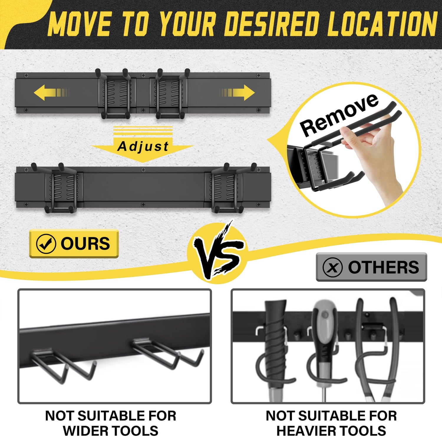 - IMPROVED DESIGN:Yard Tool Organizer for Garage.Double Upper Hooks:Wider Spacing to 2.48 inches.Double Lower Hooks:Wider Spacing to 2.52inches.Fulfills More Hanging Needs.Equipped With 9 Hooks(3 Double-Layer Hooks,3 Single Level,3 Small Hook,3 Nylon Taping) and 3 Rails.