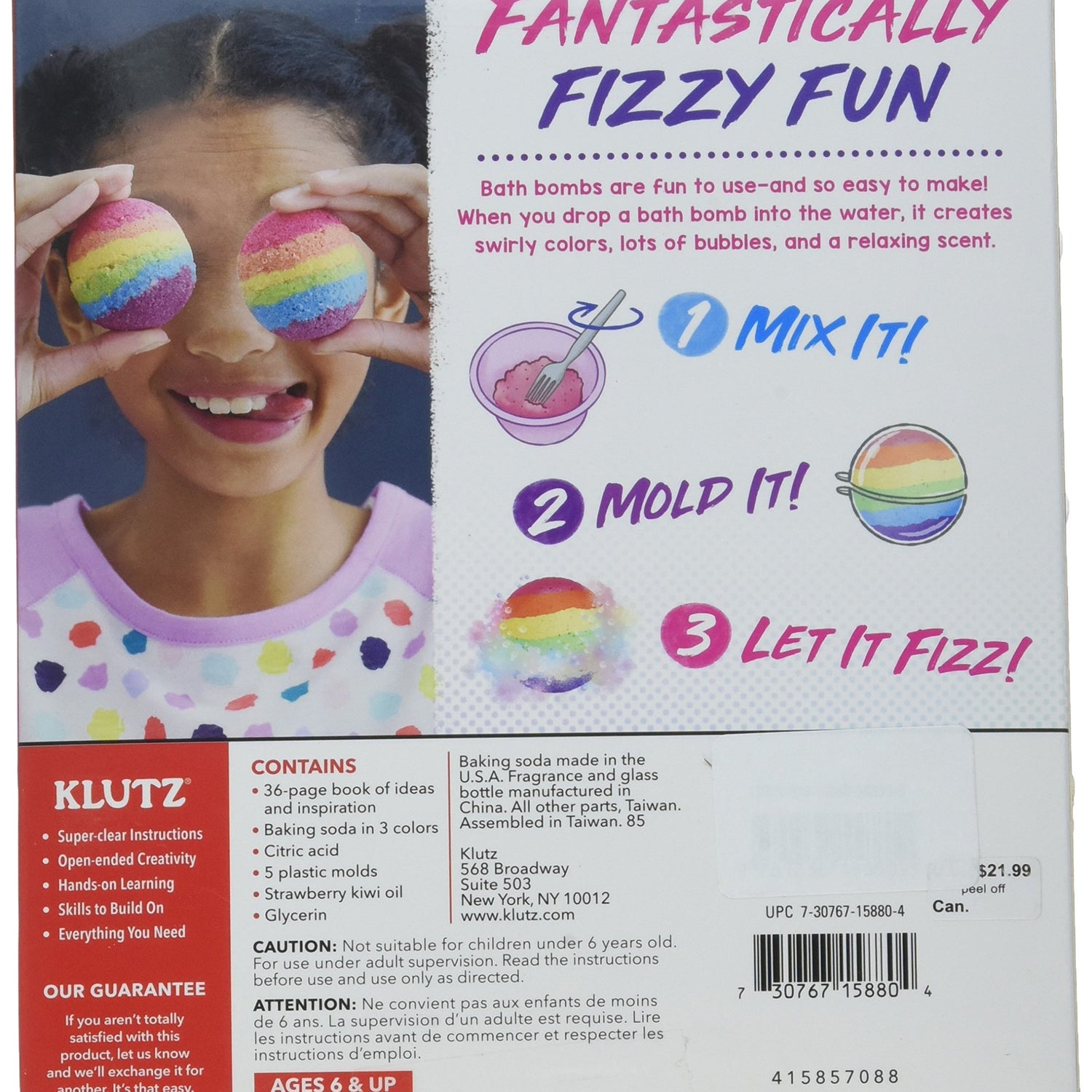 Details: Klutz-Make Your Own Bath Bombs. Transform your bath with fizzy bubbles, fun color and fantastic fragrance! Learn the science behind creating the perfect fizz and make up to ten colorful bath bombs in five different shapes. This 8x1.5x9 inch package contains baking soda in three colors, citric acid, five plastic molds, strawberry kiwi oil, glycerin and one book. Conforms to ASTM D 4236. Recommended for ages 6 and up. Imported.
