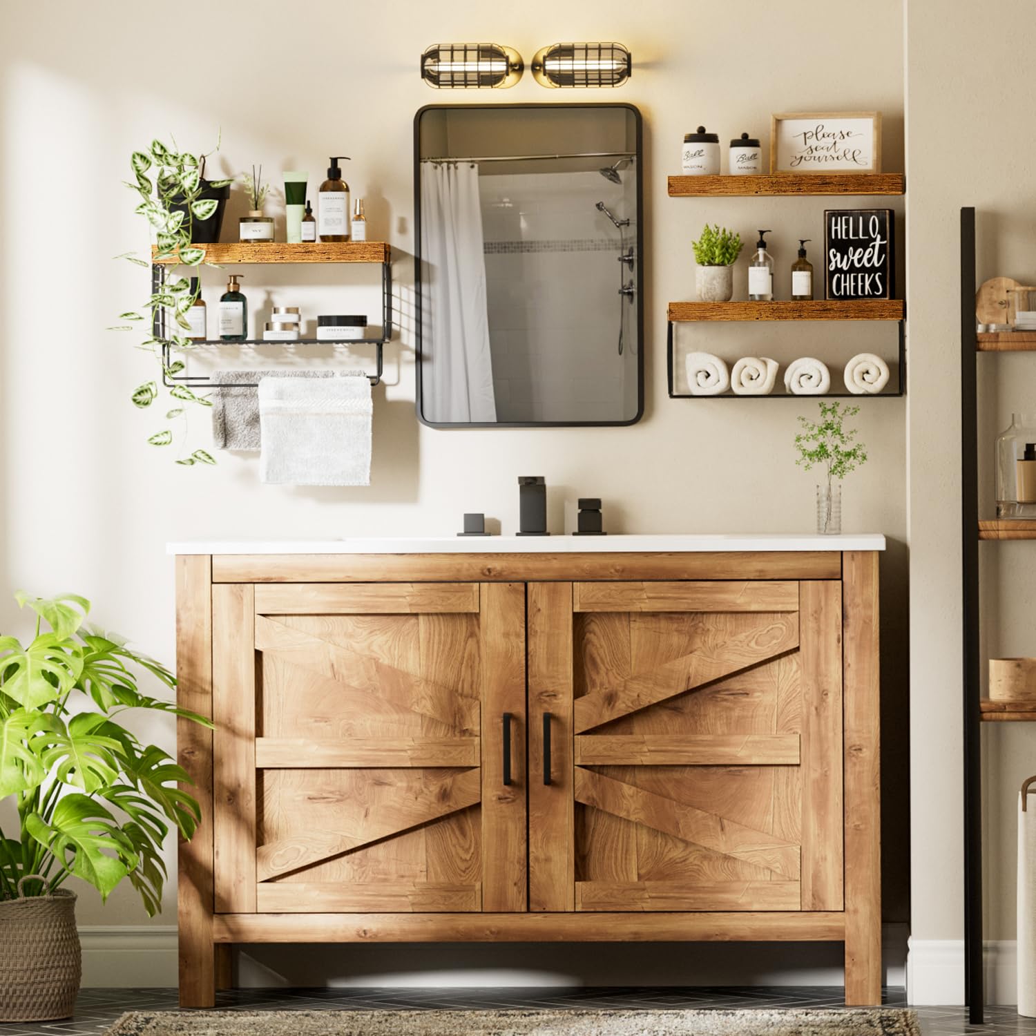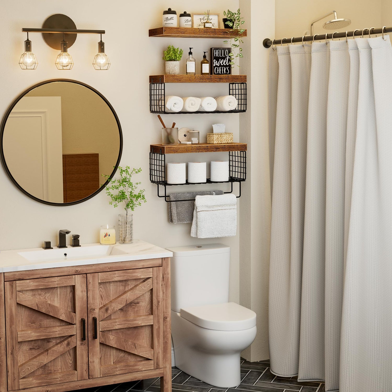 - Farmhouse Vibe: Transform a small bathroom into an orderly space with chic shelves