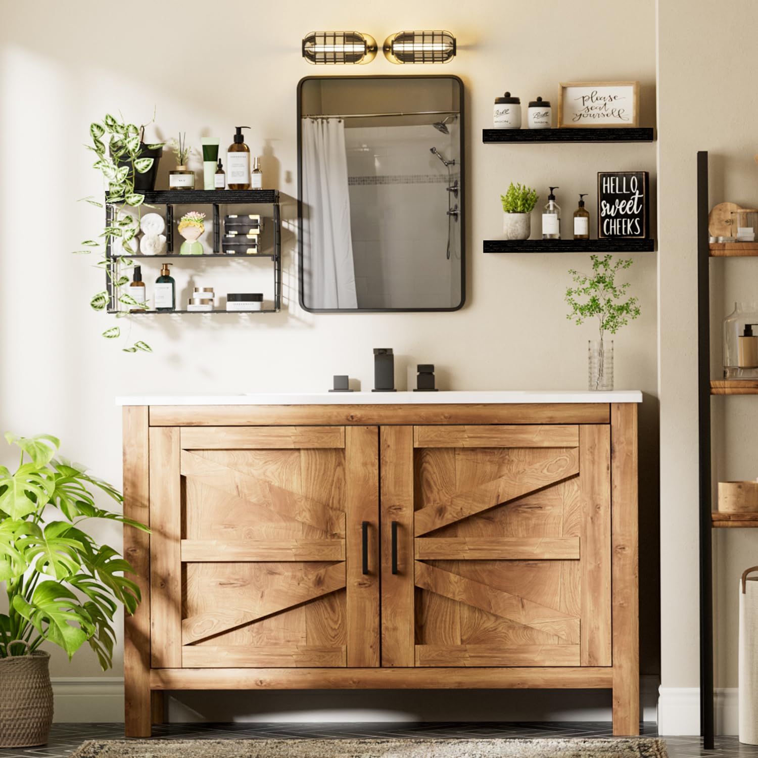 - Farmhouse Vibe: Transform a small bathroom into an orderly space with chic shelves