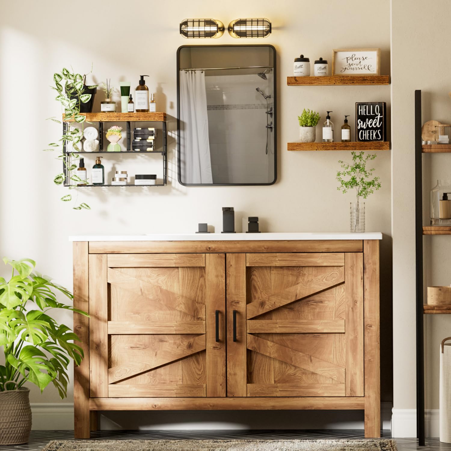 - Farmhouse Vibe: Transform a small bathroom into an orderly space with chic shelves