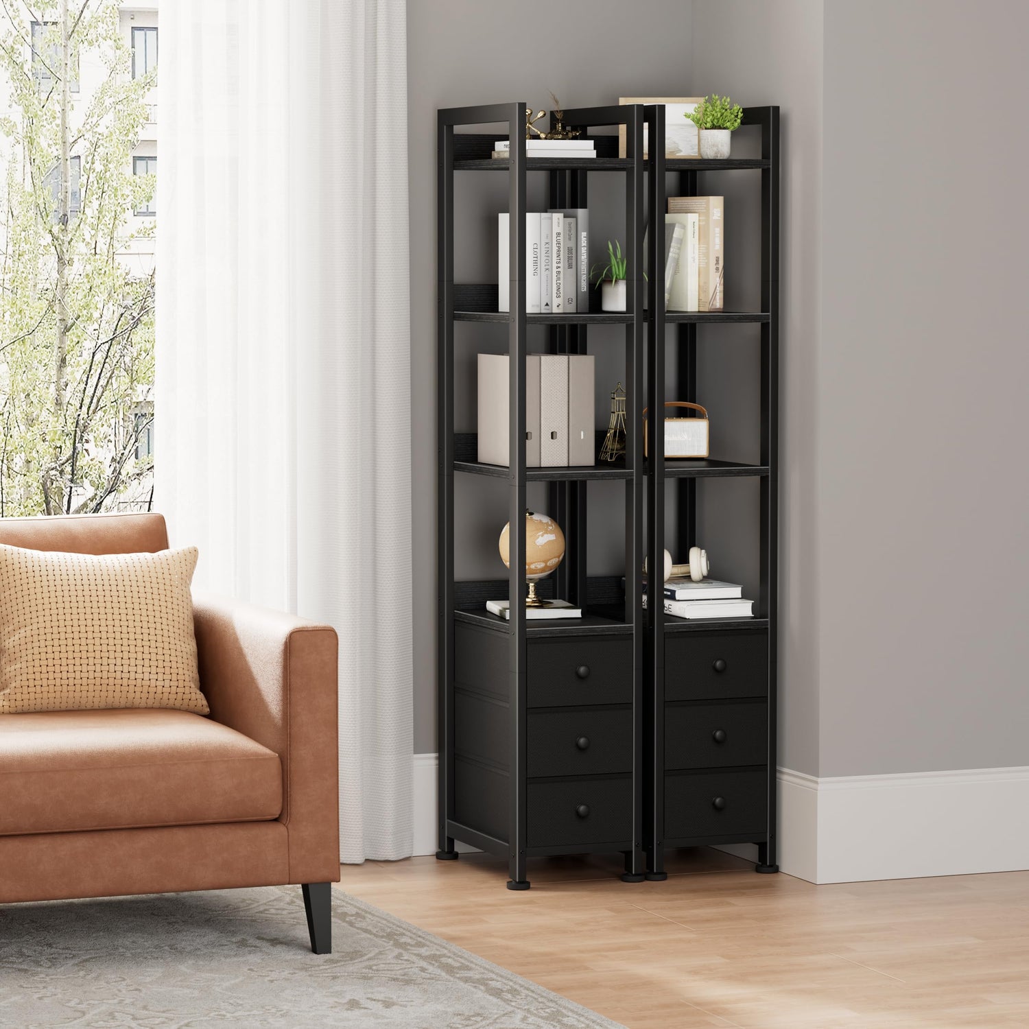 KLUVIS Black Narrow Bookshelf with 3 Drawers - 4 Tier Thin Book Shelf for Small Spaces Skinny Shelves Slim Farmhouse Fabric Drawer 60 inch Tall (04B)