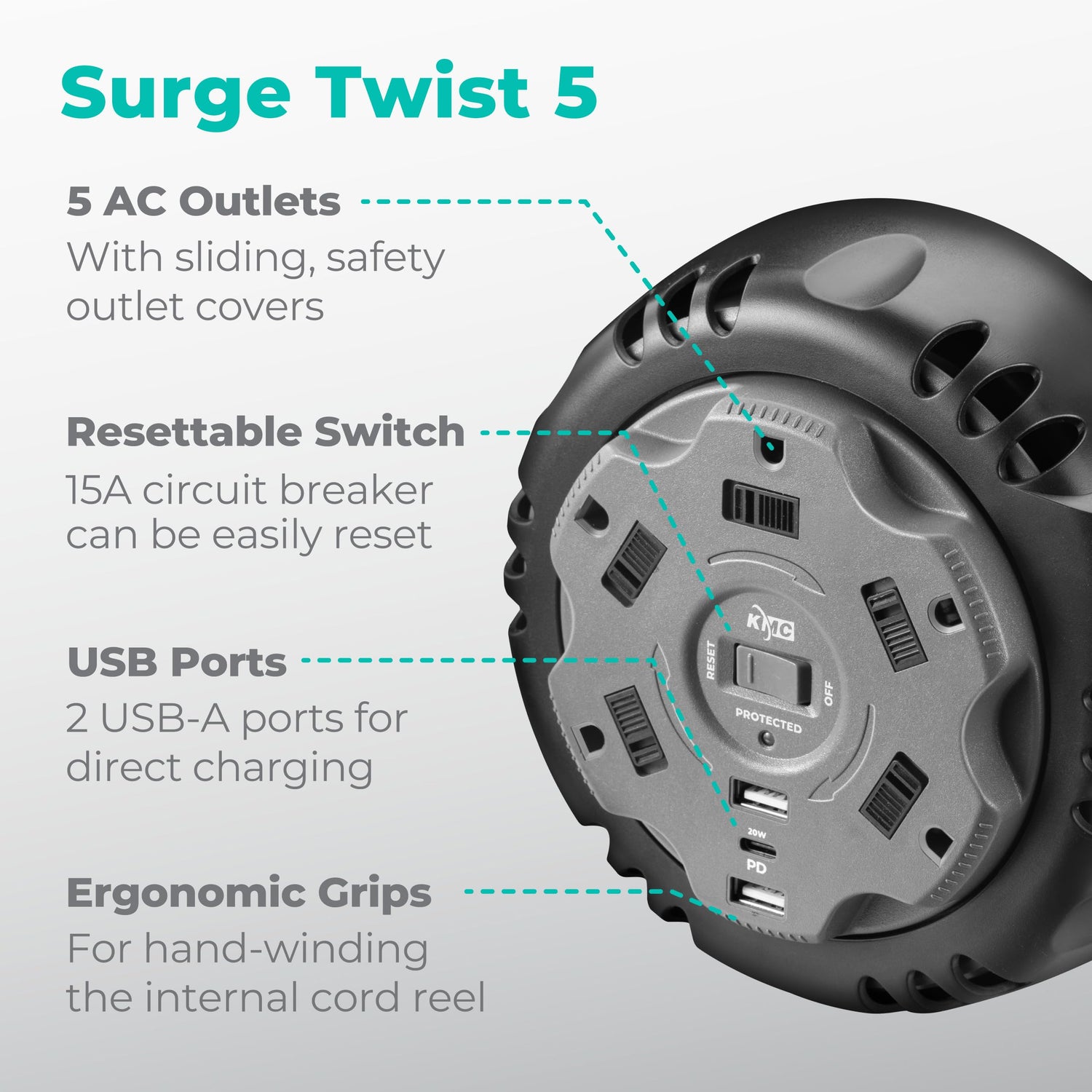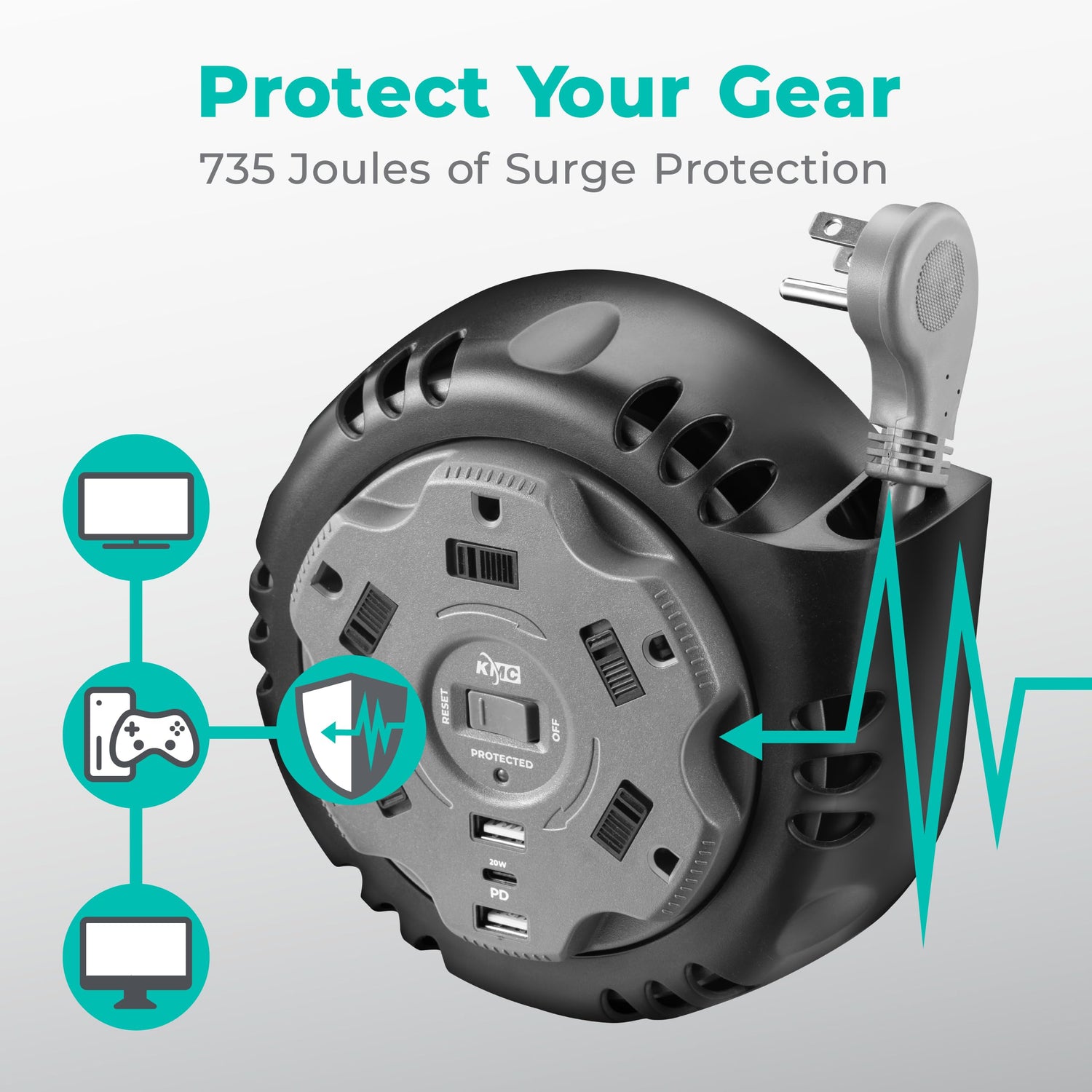 Details: KMC 5-Outlet USB-C PD Surge Twist Power Strip Cord Reel, 2 USB-A & 1 USB-C Power Delivery Ports, 735J Surge Protector, 8ft Long Retractable Extension Cord, 3-Prong Flat Plug, UL/ETL Certified, Gray. Electrical Ratings: 10A 125V 60Hz 1250W. KMC devices come with US-based technical support and a lifetime warranty