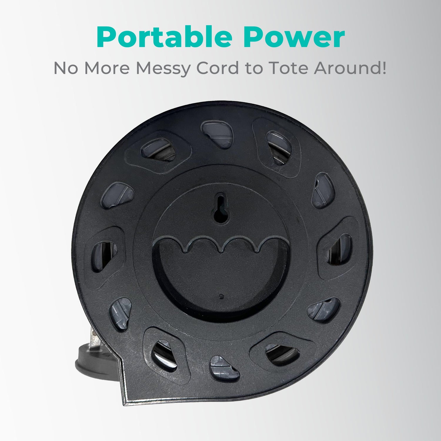 - CONVENIENT: This self-contained and portable surge protector has a 8-foot 14/3 retractable extension cord that manually winds into an internal cord reel. The durable PVC cord has a low-profile plug to easily fit behind furniture.