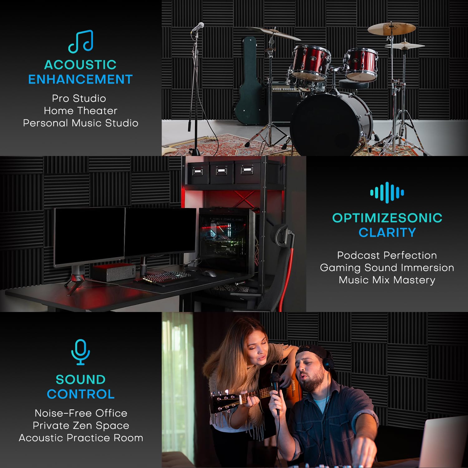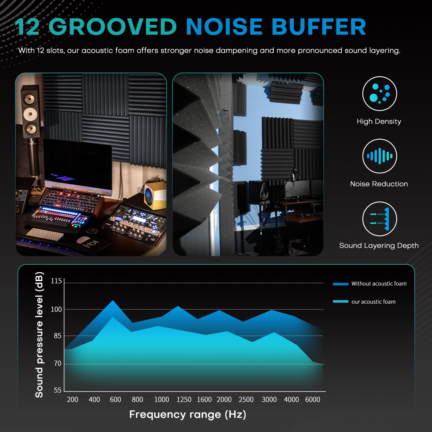 - PROFESSIONAL SOUND ABSORBING PROPERTIES – Our acoustic foam panels are expertly designed to reduce noise pollution by absorbing sound rather than blocking it. They minimize echoes and unwanted background noise, creating a cleaner, more focused audio environment. Unlike soundproofing, acoustic foam specifically manages reverberation, making it ideal for studios, recording booths, control rooms, and radio stations. Use our foam to eliminate standing waves and flutter in spaces of any size, ensuring professional-grade sound quality for your projects.