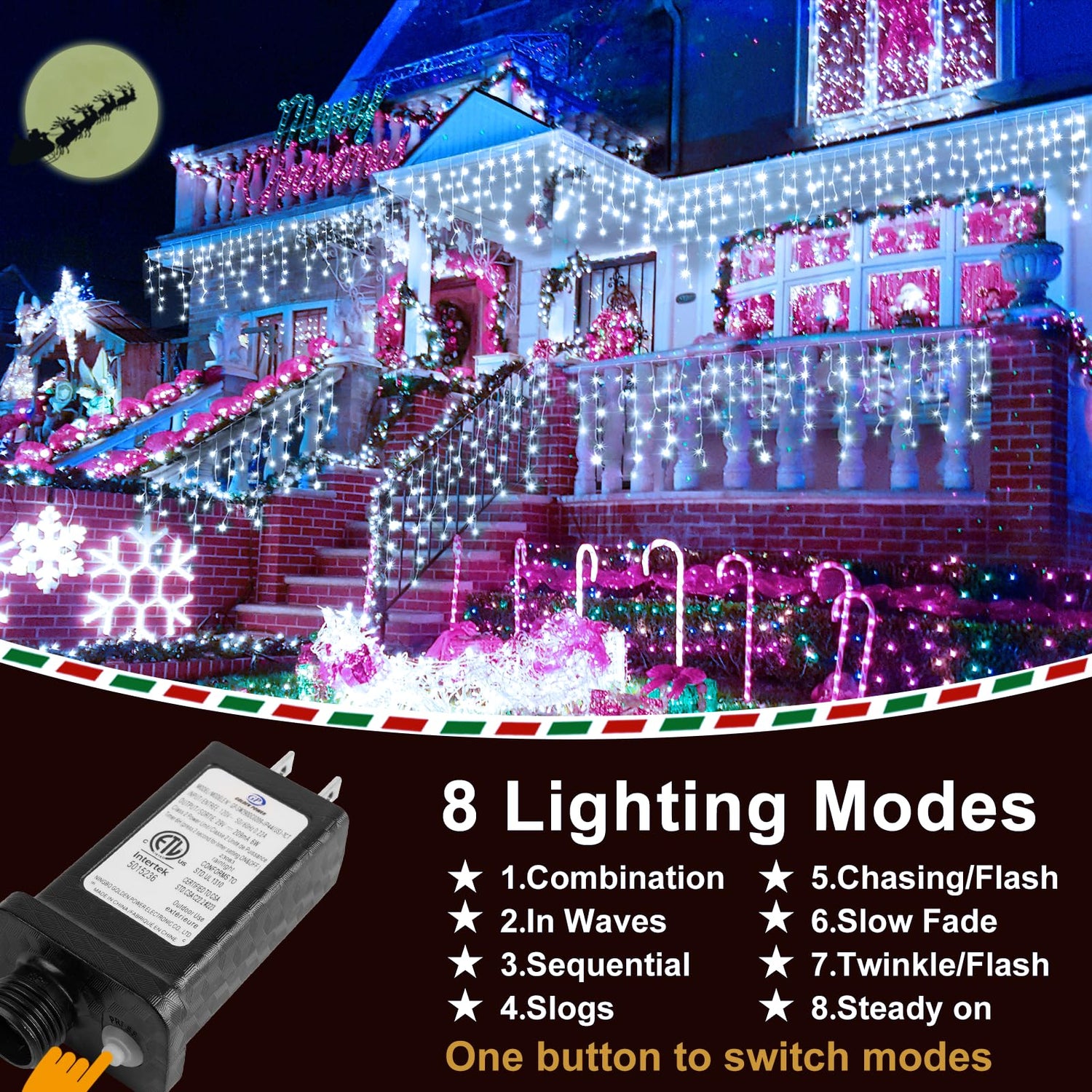 - 400 LED Christmas Lights: Length is 33ft with 75 drops, 400 LEDs, and plug lead length is 9.84FT, which can be easily installed in the place where decoration is needed. Including UL588 Listed Plug, 1 steady on +7 Variable Lighting Modes, Connectable, and Timer & Memory Function. Whether decorating your Christmas house, New Year party,or Wedding, it will cast a funny and warm festive atmosphere. KNONEW outdoor Christmas lights must be your best choice to your family for Christmas decorations.
