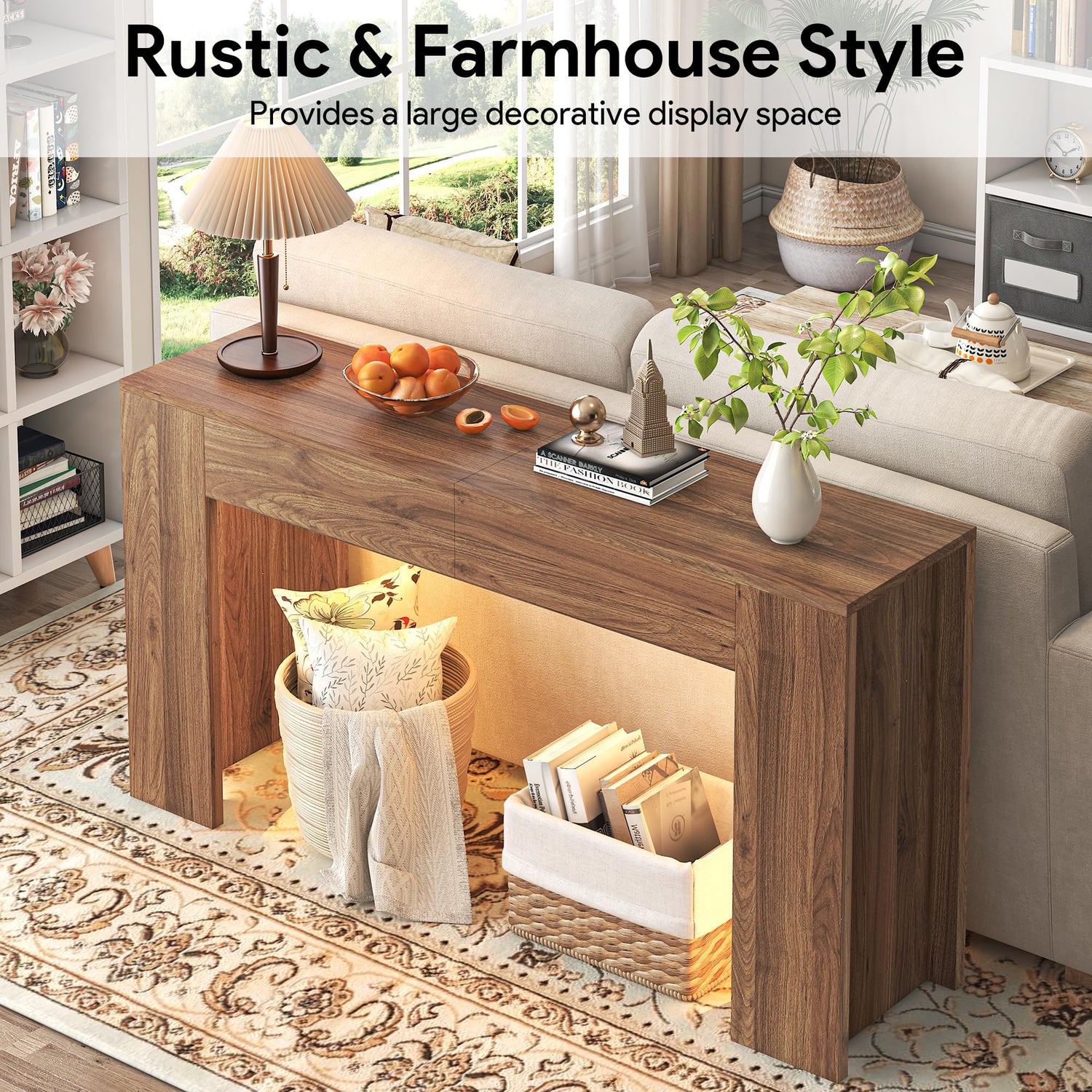 knoworld 63-Inch Long Console Table with LED Light, Farmhouse Sofa Table Behind Couch, Wooden Console Table for Entryway, Hallway, Entrance, Living Room