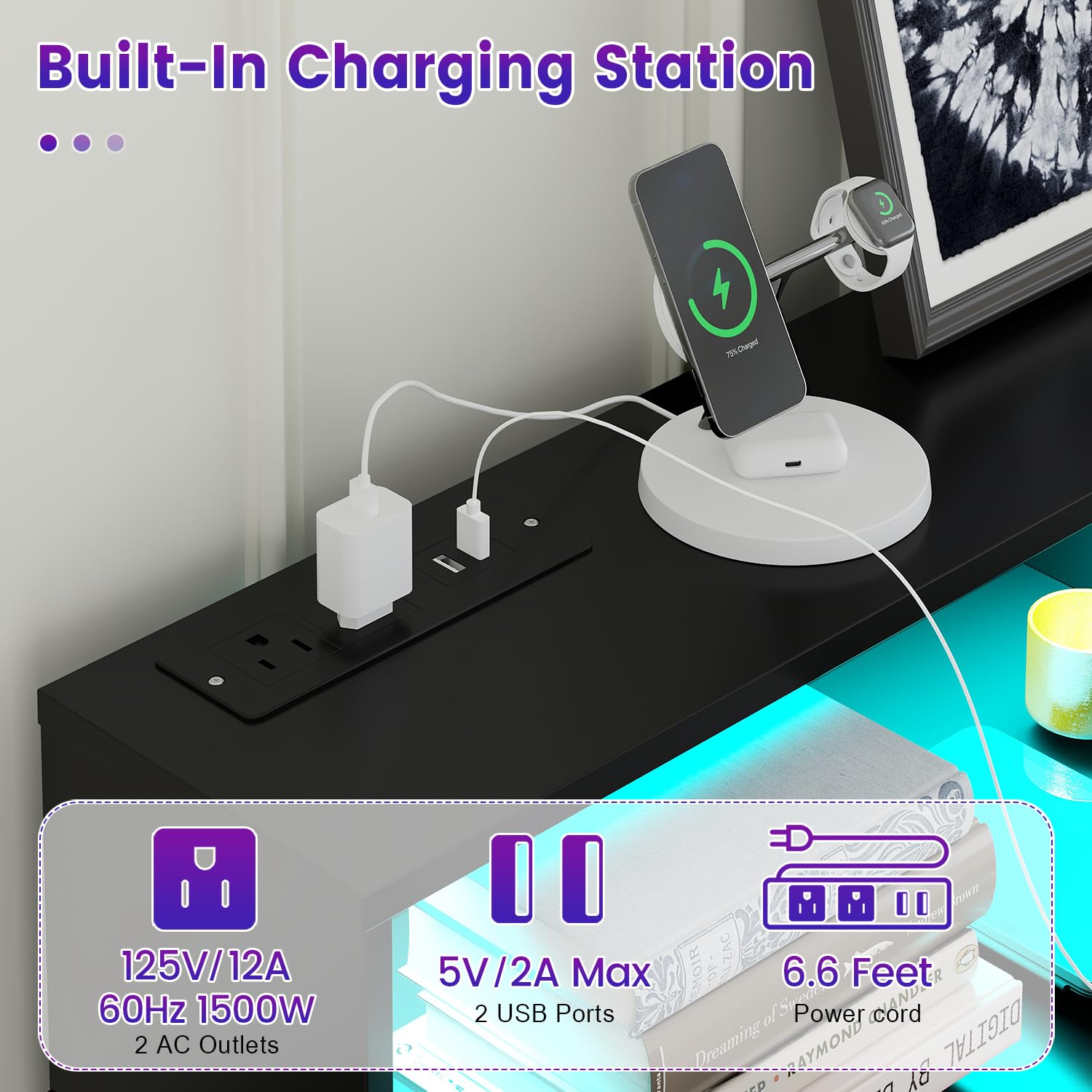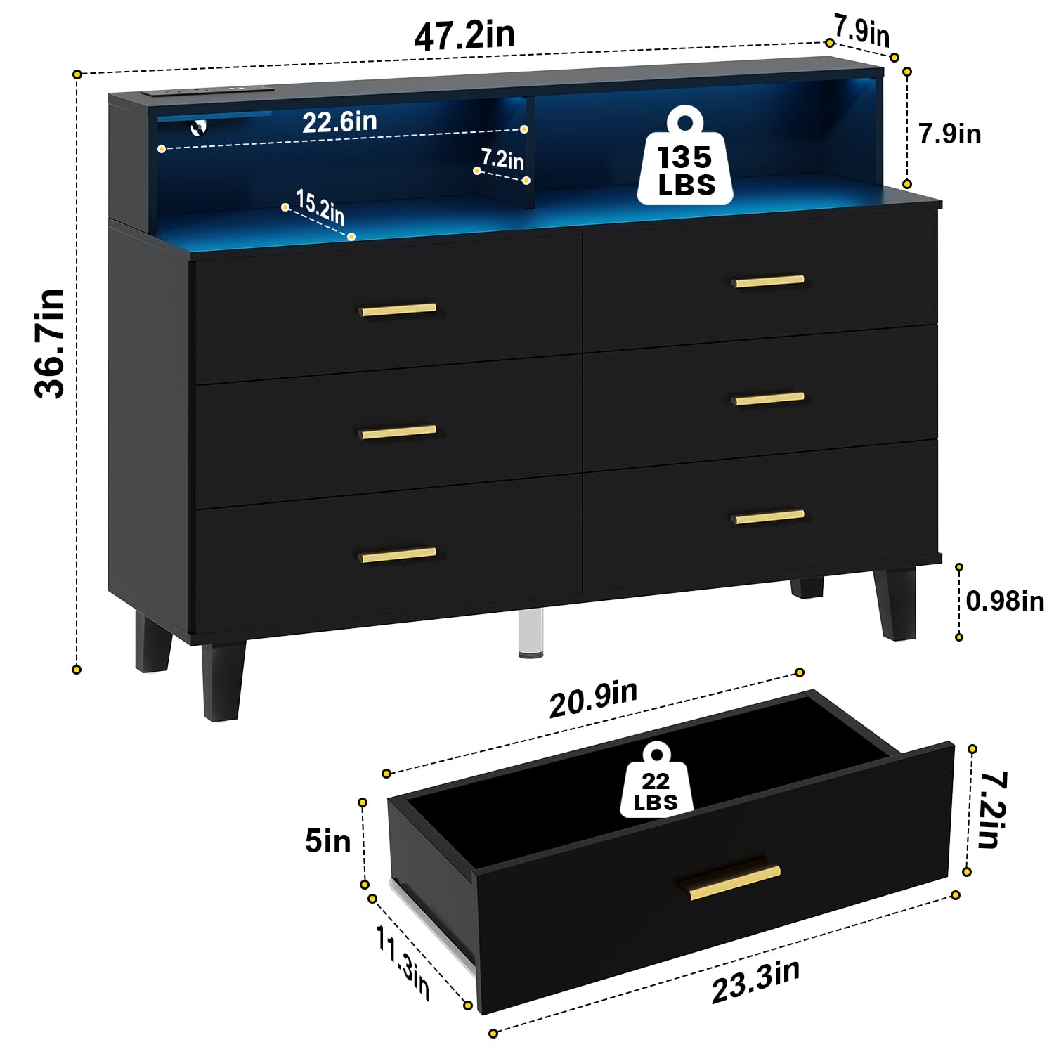 - Chest of Drawers with Charging Station: This bedroom dressers with drawers features a power outlet, which creates convenience for device charging. led dresser has 2 AC outlets and 2 USB ports, so you can charge your laptop, mobile phone, table lamp, hairdryer, and other small appliances without the need for an additional charger. That makes things so much easier for you if you don't have many outlets in your room.