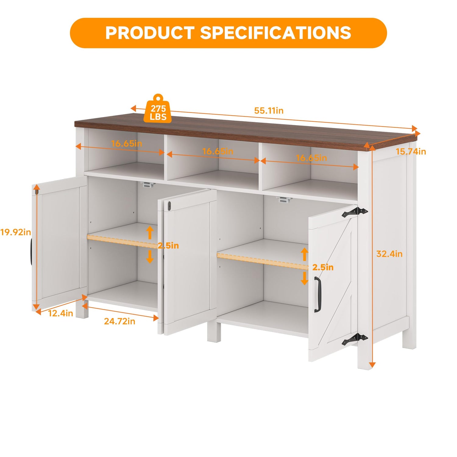 - Stylish & Elegant Design - Rustic walnut tabletop and with classic barn doors of this white buffet cabinet, adds a great farmhouse flair to your home, vintage Arrowhead Styled Hinges give the cabinets a simple and rustic appeal. Blends easily with decor style from traditional to contemporary, modern.