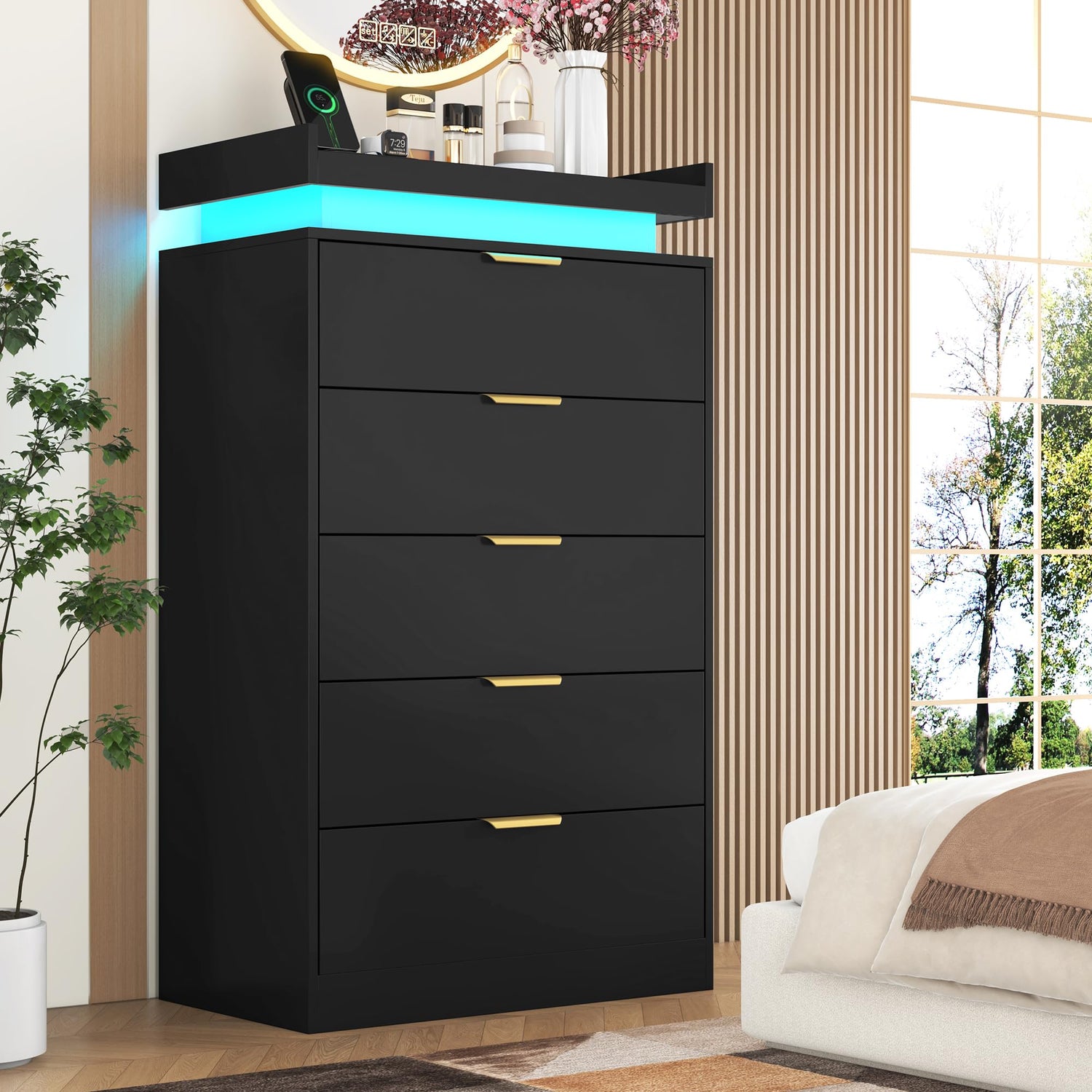 knoworld Tall Dresser for Bedroom, Black Dresser with LED Lights, Wood 5 Drawer Chest with Power Outlet, Modern Chest of Drawers for Bedroom, Living Room, Entryway, Hallway