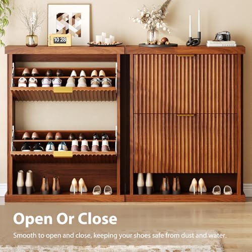 knoworld Walnut Shoe Cabinet Storage for Entryway,2 Flip Drawers with Toe Kick Space,Narrow Wood Fluted Shoe Rack Cabinet,Fluted Slim Shoe Cabinet for Foyer,Hallway