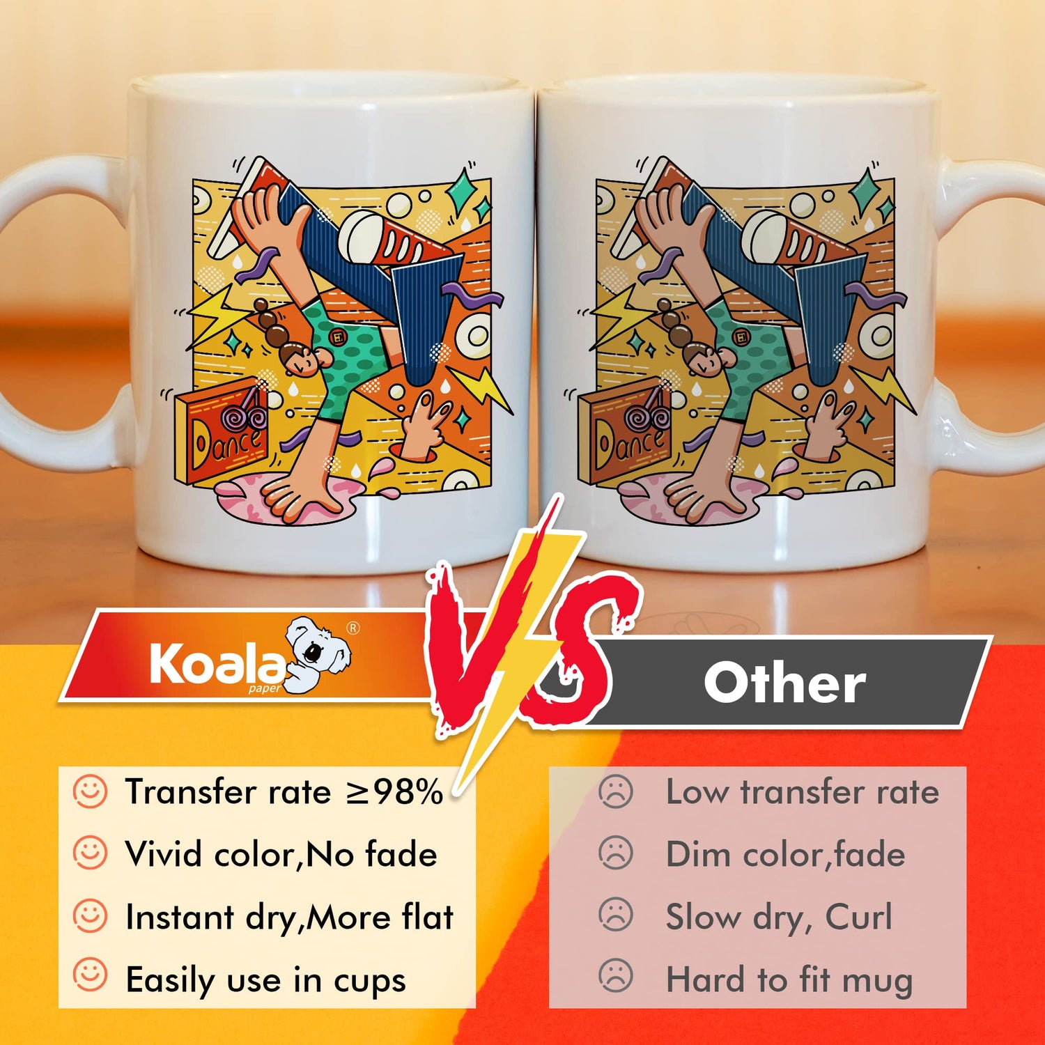 - Koala sublimation paper 105g is thin paper, comes out of the printer completely dry, you don't have to wait for the paper to dry, easily wrap around the tumblers or mugs. Over 98% Ultra High transfer rate, maintaining vibrant color and precision plus greater ink saving.It’s an affordable solution for your business needs!