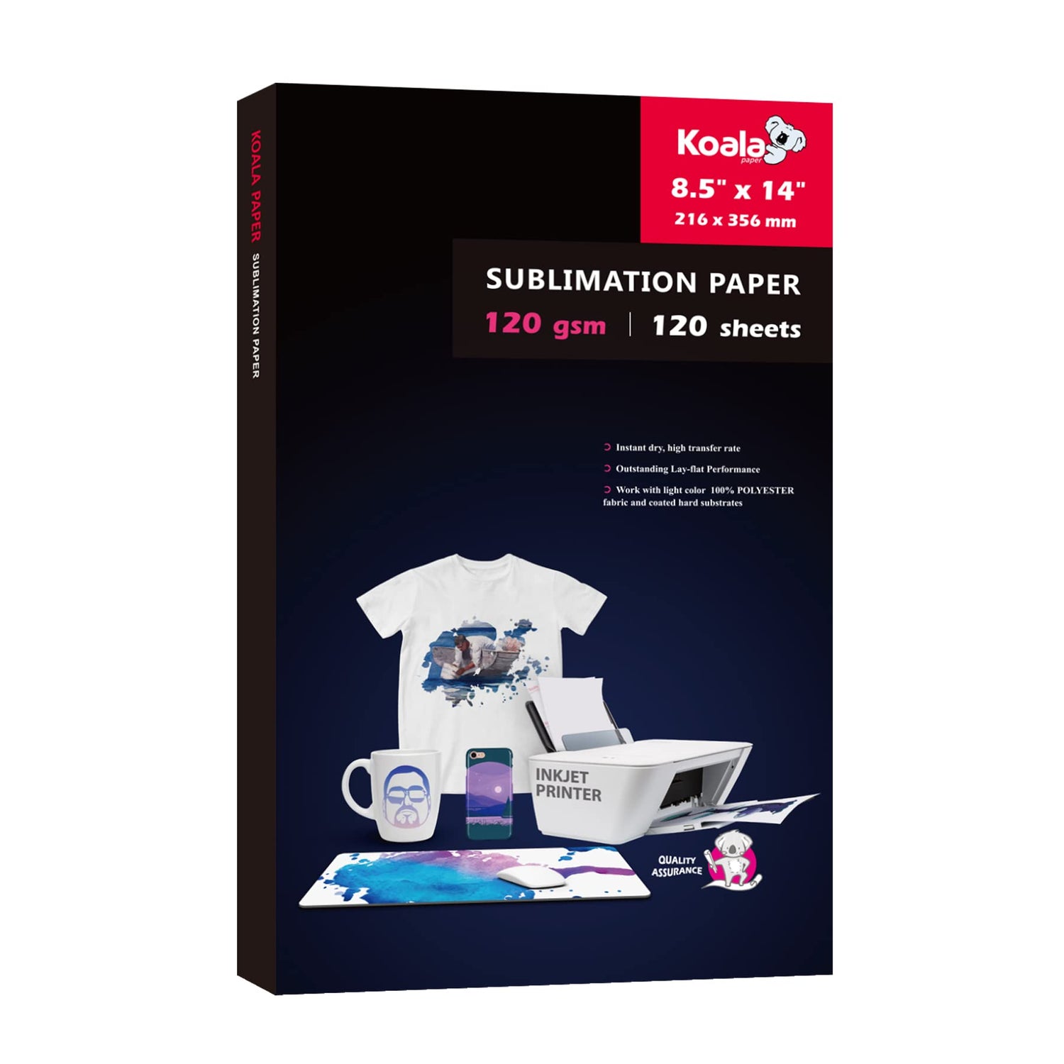 - Each package contain 120 sheets 8.5x14 sublimation paper(120gsm) and detail transfer instruction. All sublimation sheet comes with koala logo pattern on the back to help you quickly find the printable side.