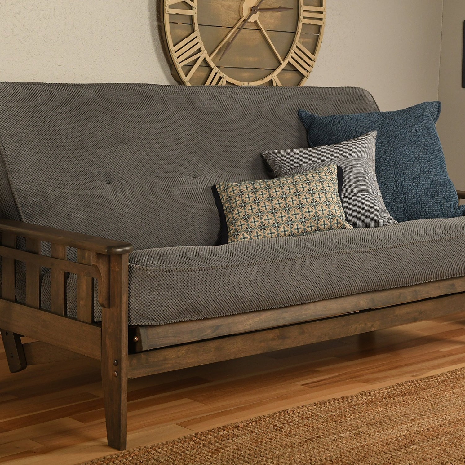 Details: The Tucson futon in rustic walnut finish is a classic hardwood frame with Mission style arms. This unique and versatile full size futon sofa easily converts to a bed. This multifunctional piece of furniture can find a home in just about any type of room. Frame Dimensions: 81L x 37D x 33H; mattress Dimensions: 75L x 54W x 8H