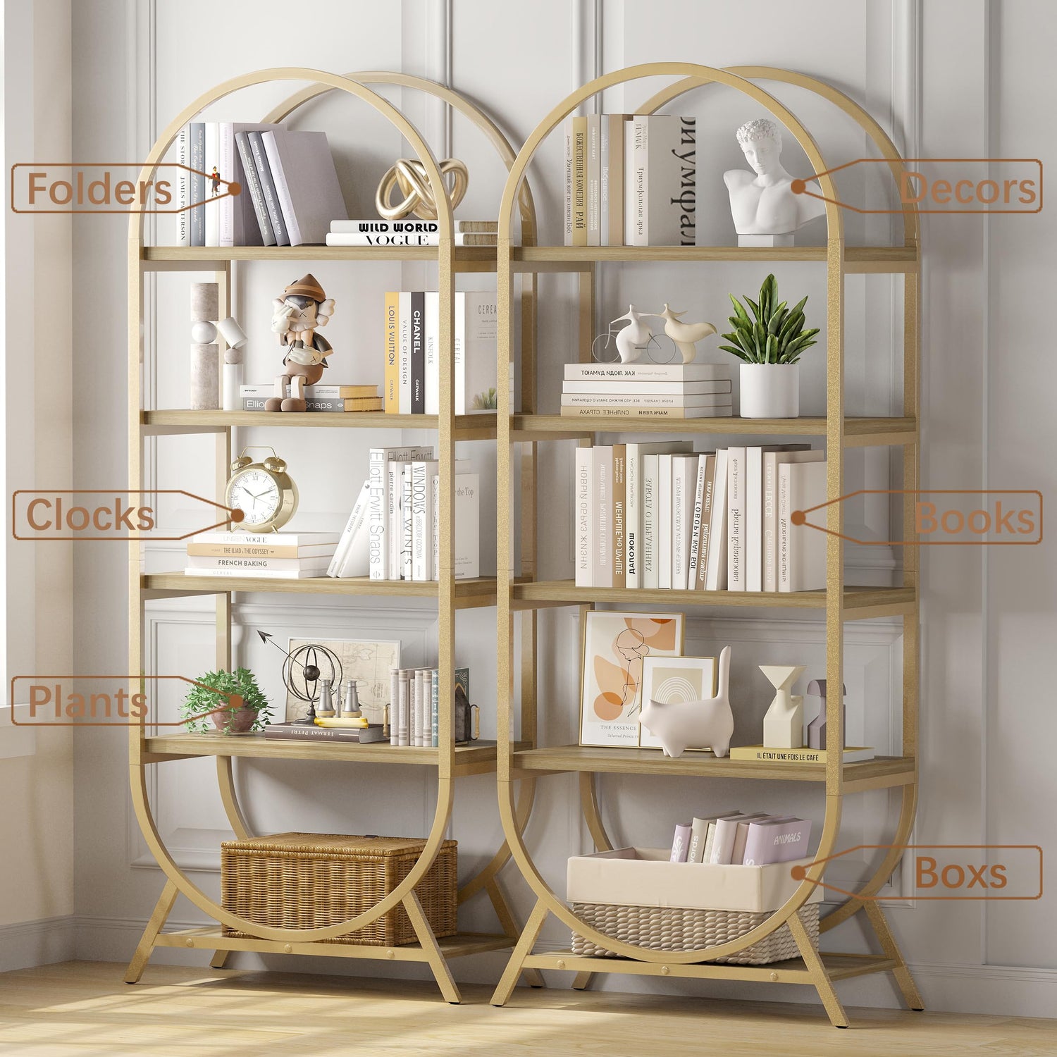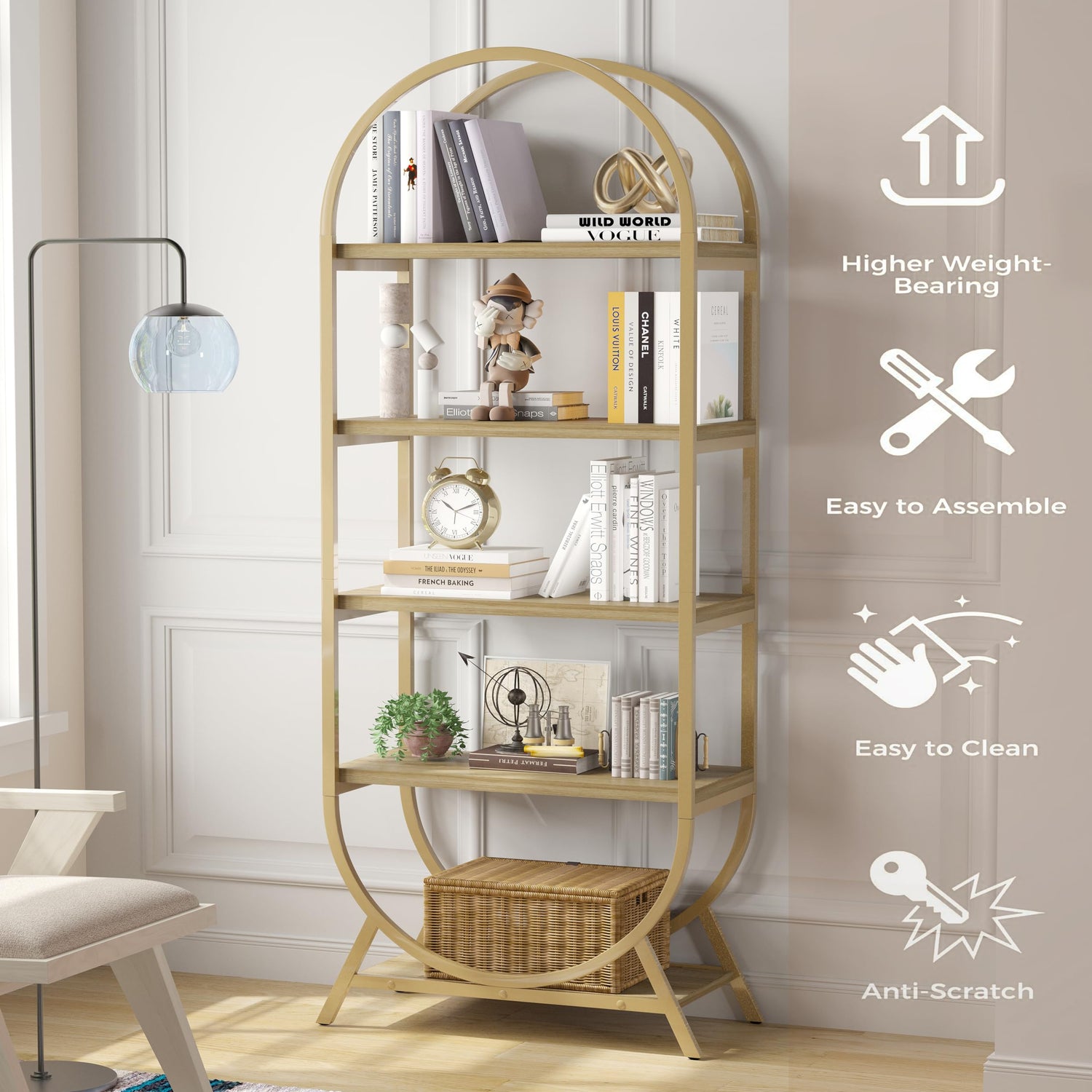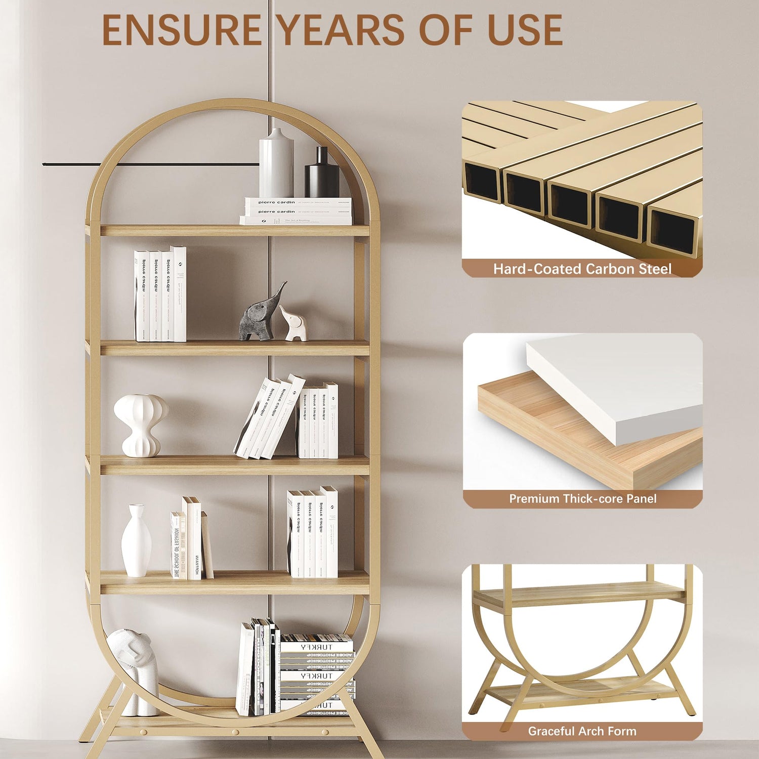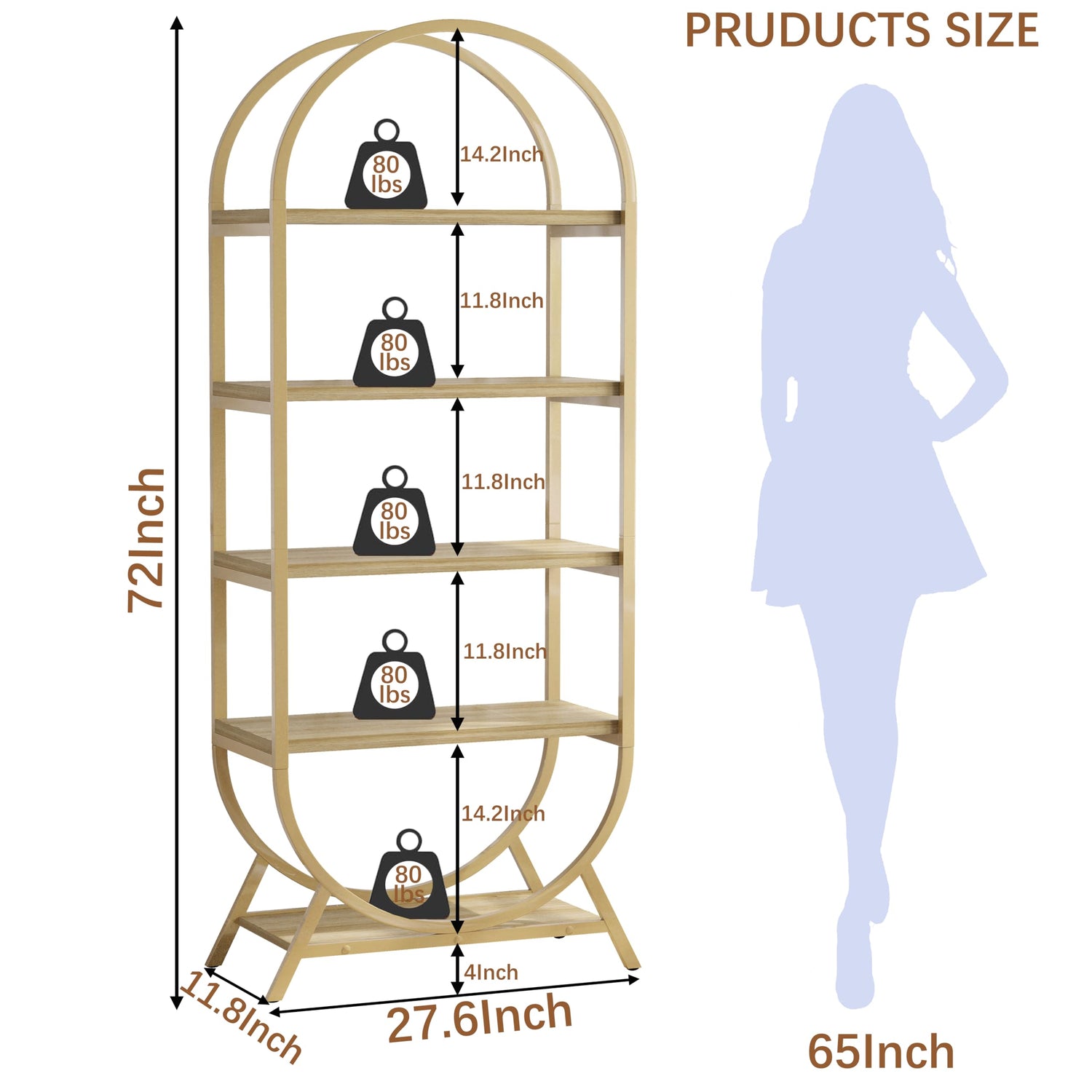 Kogven Bookshelf Arched Bookcase, Industrial 5 Tier Open Book Shelves with Metal Frame, 72" Tall Freestanding Display Rack for Home Office, Living Room,Nature Wood and Gold