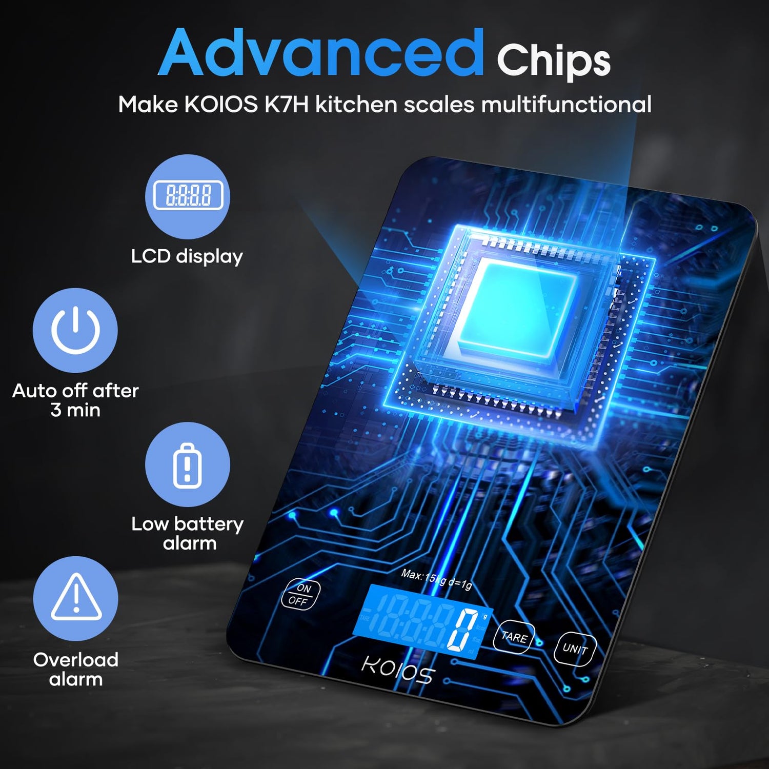 - [Precise Weight & Sensitive Sensors] Built-in four sensitive load sensors, upgraded K7H digital food scale can give you accurate weighing within a short time. Adopts anti-slip design, it improves safety and stability. Range of measurement: 0.1oz to 33lbs (3g to 15 kg). 1g or 0.1oz increments when adding ingredients.