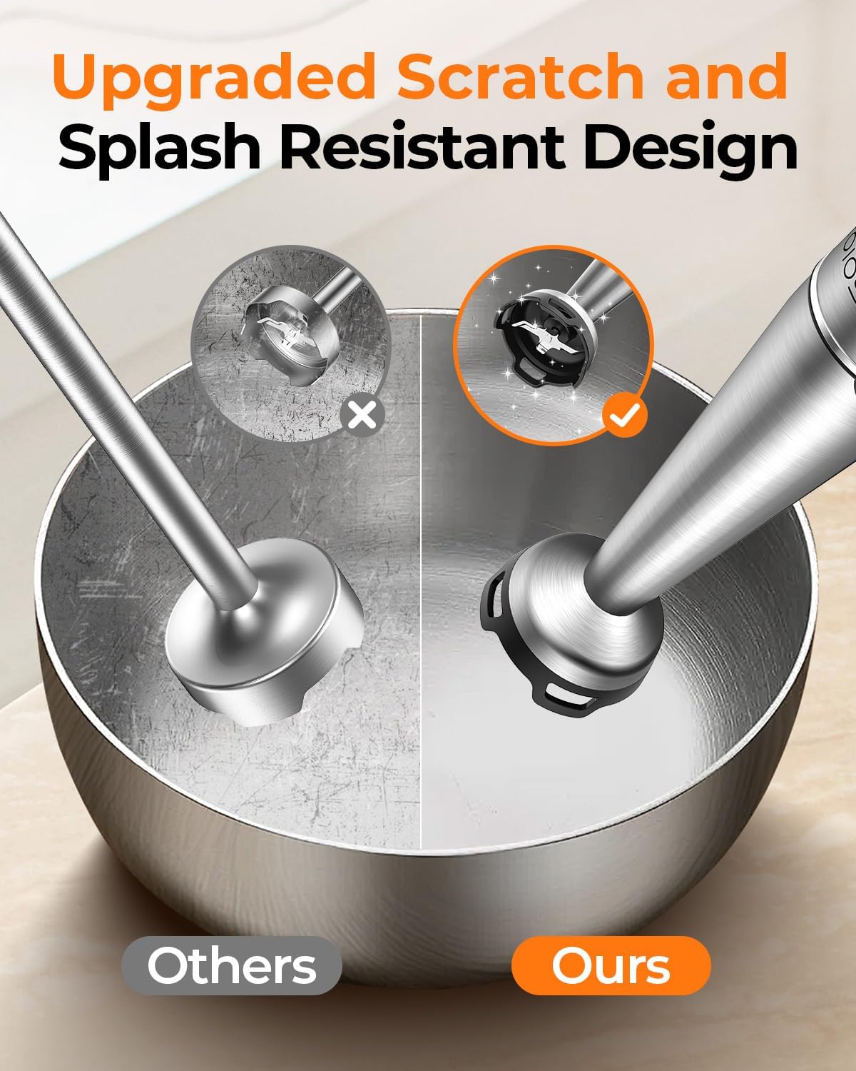 - Scratch and Splatter Free with Pot Protector:The food-grade nylon blade guard protects cookware from scratches. You don't have to worry about scratches on your favorite cookware while using the hand blender. The unique splash guard prevents spills and keeps your clothes and kitchen clean for hassle-free cleanup