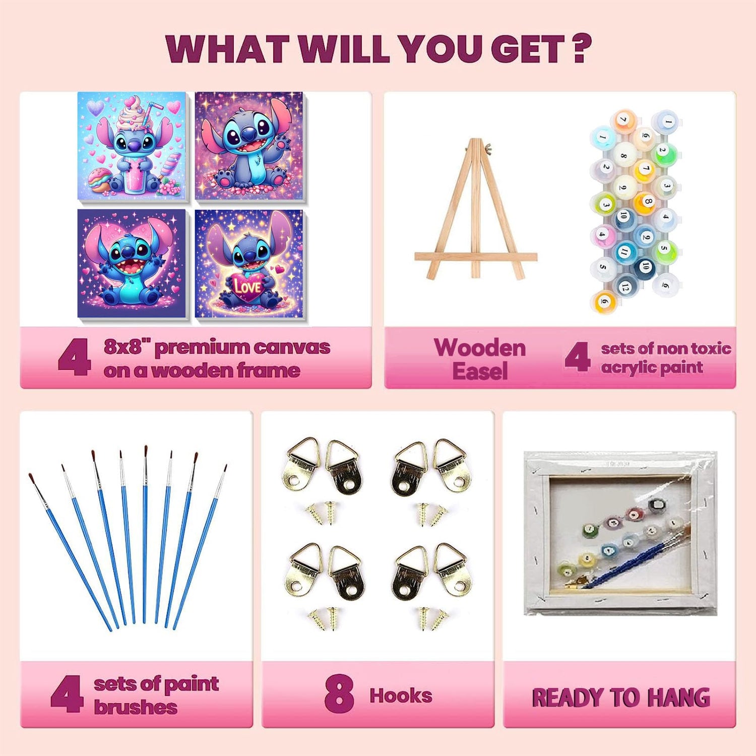 KOJEFCV 4 Pack Cartoon Paint by Numbers for Kids with Framed Canvas-with Wooden Easel, Paint by Number for Kids Ages 4-8-12, DIY Easy Acrylic Oil Painting Kits for Home Wall Decor (8X8inch)