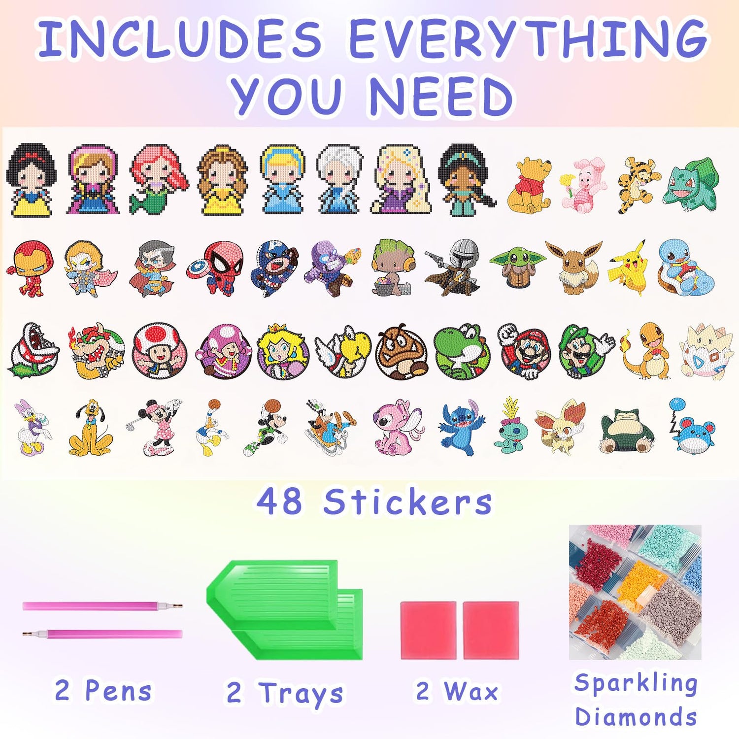 KOJEFCV 48 Pcs Cartoon Diamond Art Painting Sticker Kits for Kids-Cartoon Diamond Gem Stickers Kit,5D Gem Art Stickers Mosaic for Kids Gift for Boys Girls 4-8-10-12 Years Old