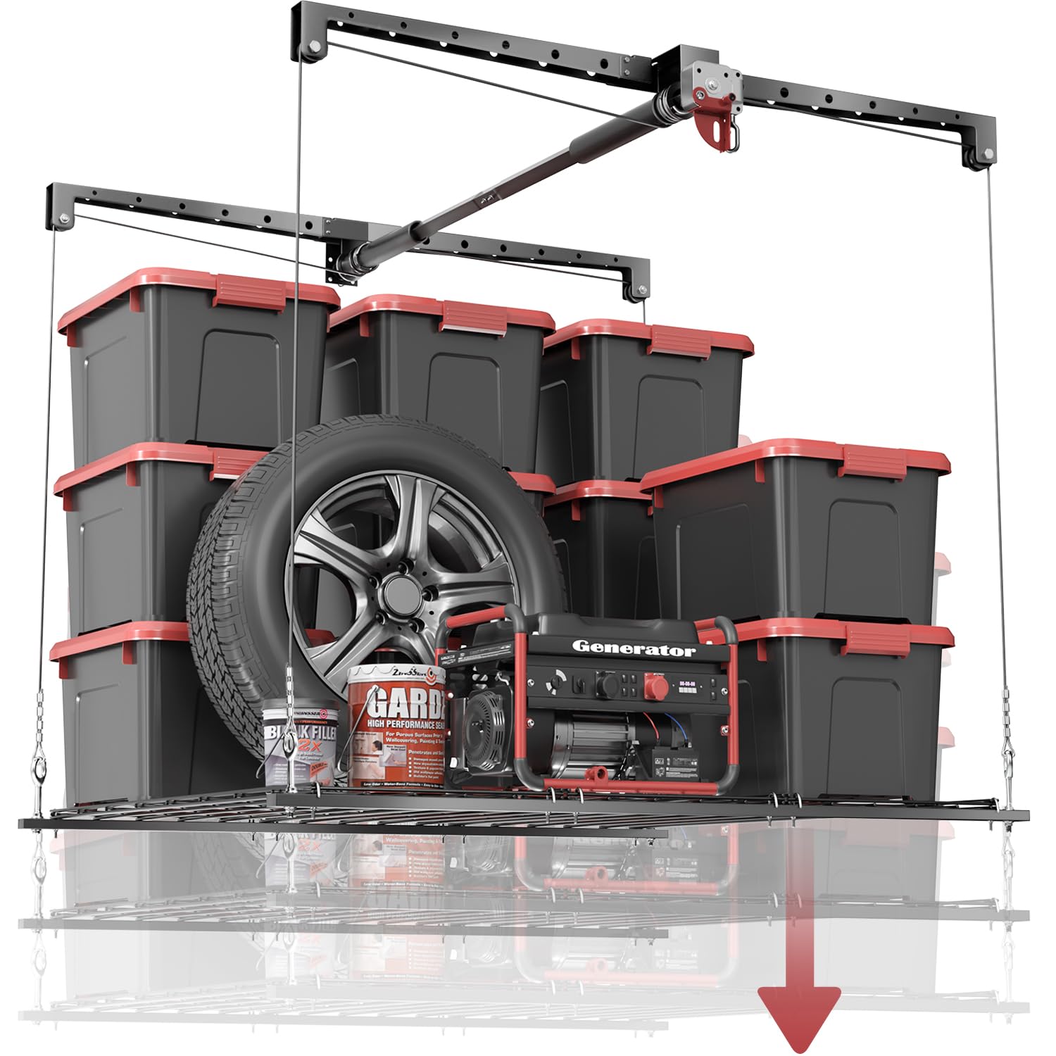 - Innovative Design for Easy Access: Elevate your garage organization with this overhead garage storage lift. Unlike traditional garage storage shelves, our product allows for effortless access, making storing and retrieving items a breeze, without the need for ladders.