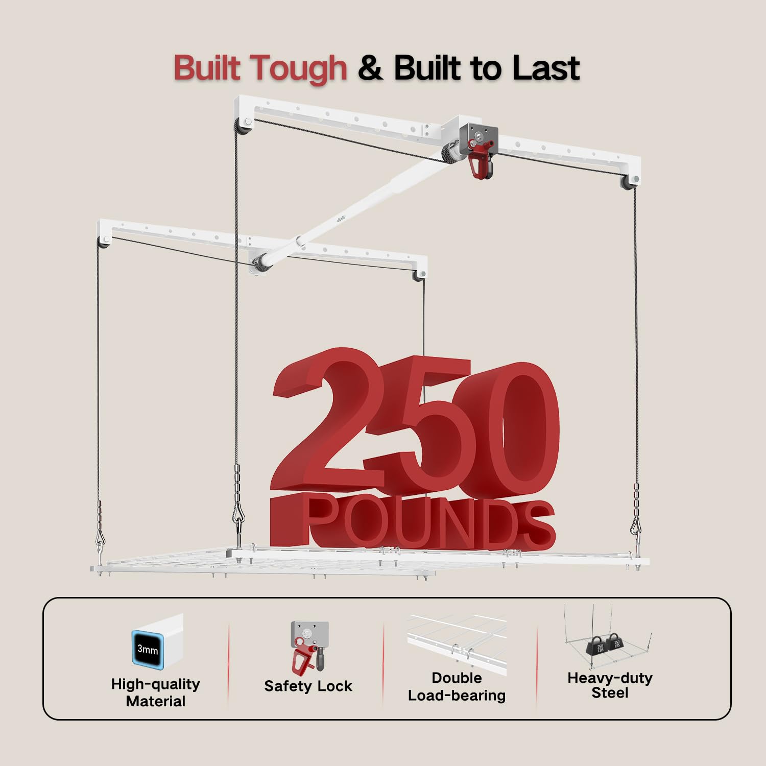 - Added Manual Lock for Maximum Safety: KOKORACKER garage storage lift system comes with an additional manual lock, offering an extra layer of security. This feature ensures that your belongings are securely stored and steadfastly held in position, giving you peace of mind.