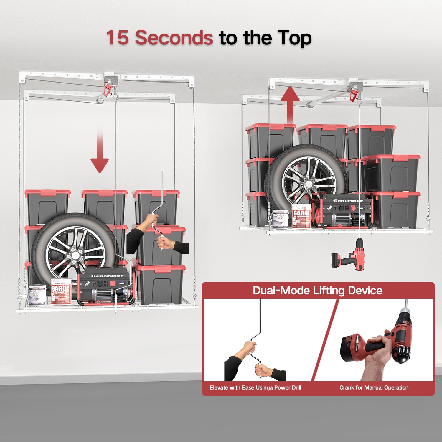 - Innovative Design for Easy Access: Elevate your garage organization with this overhead garage storage lift. Unlike traditional garage storage shelves, our product allows for effortless access, making storing and retrieving items a breeze, without the need for ladders.