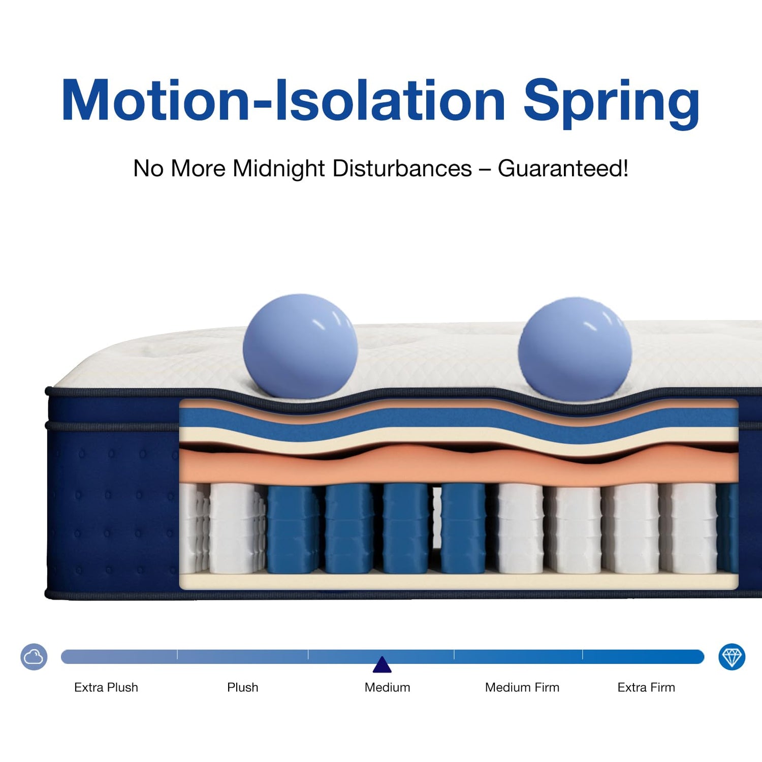 - SUPER QUIET : Our mattresses are designed with high-quality independent pocket springs and high-density memory foam, which work together to absorb the noise and vibration generated by tossing and turning during sleep, allowing you to sleep peacefully without being woken up by noise, creating a quiet, undisturbed sleep environment for you and your partner. Experience truly restful, rejuvenating sleep.