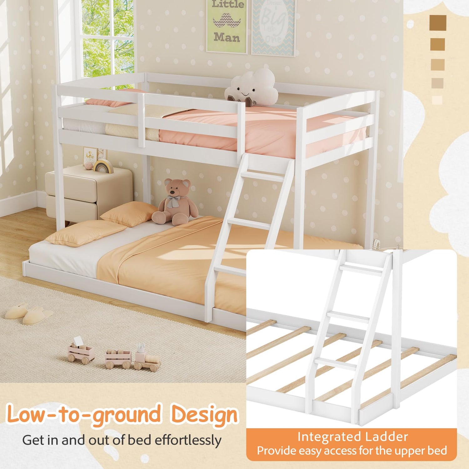 KOMFOTT Low Bunk Bed Twin Over Full, Solid Wood Twin Bed Frame with Built-in Ladder & Safety Guardrails, Space-Saving Low Bunk Bed for Kids, Teens, No Box Spring Needed