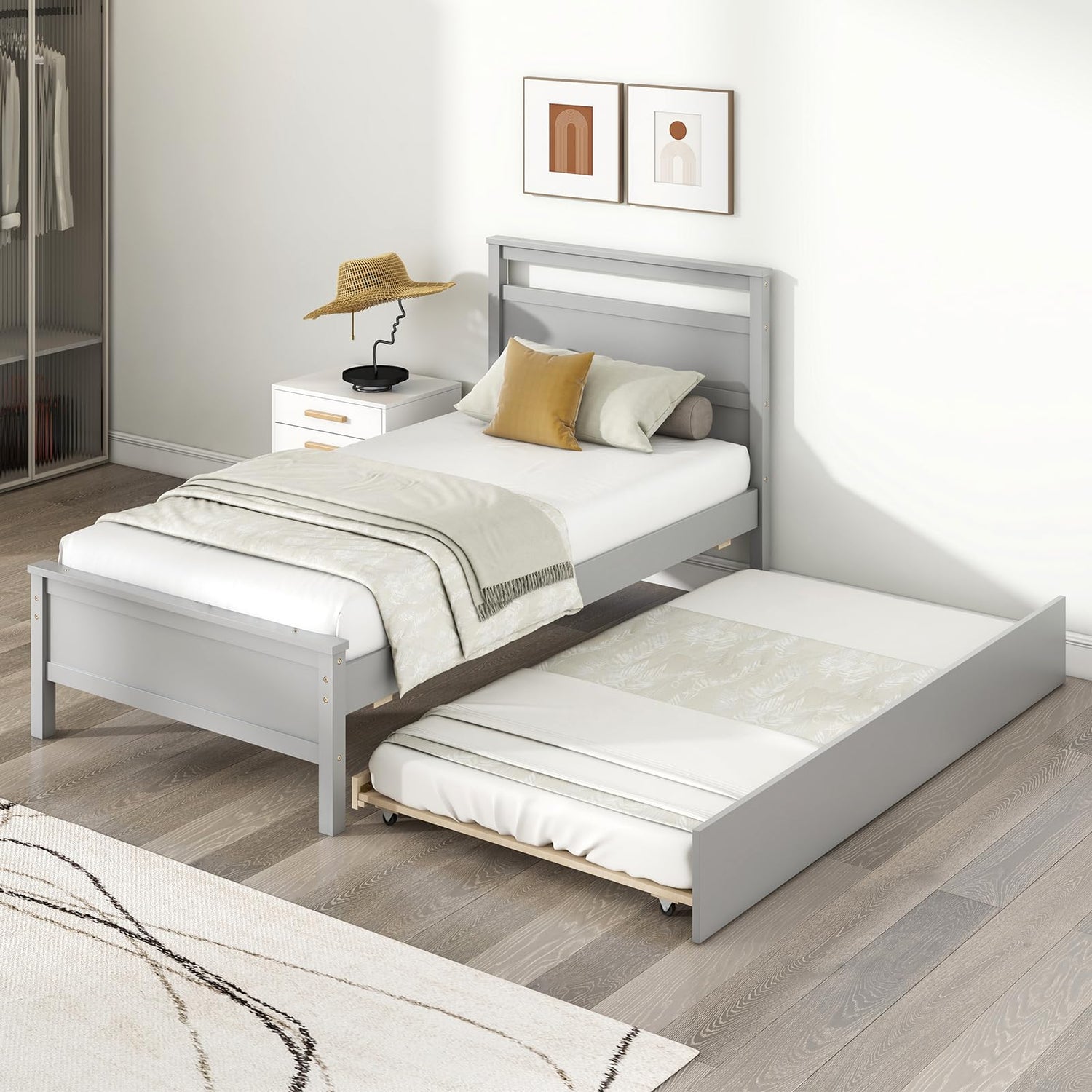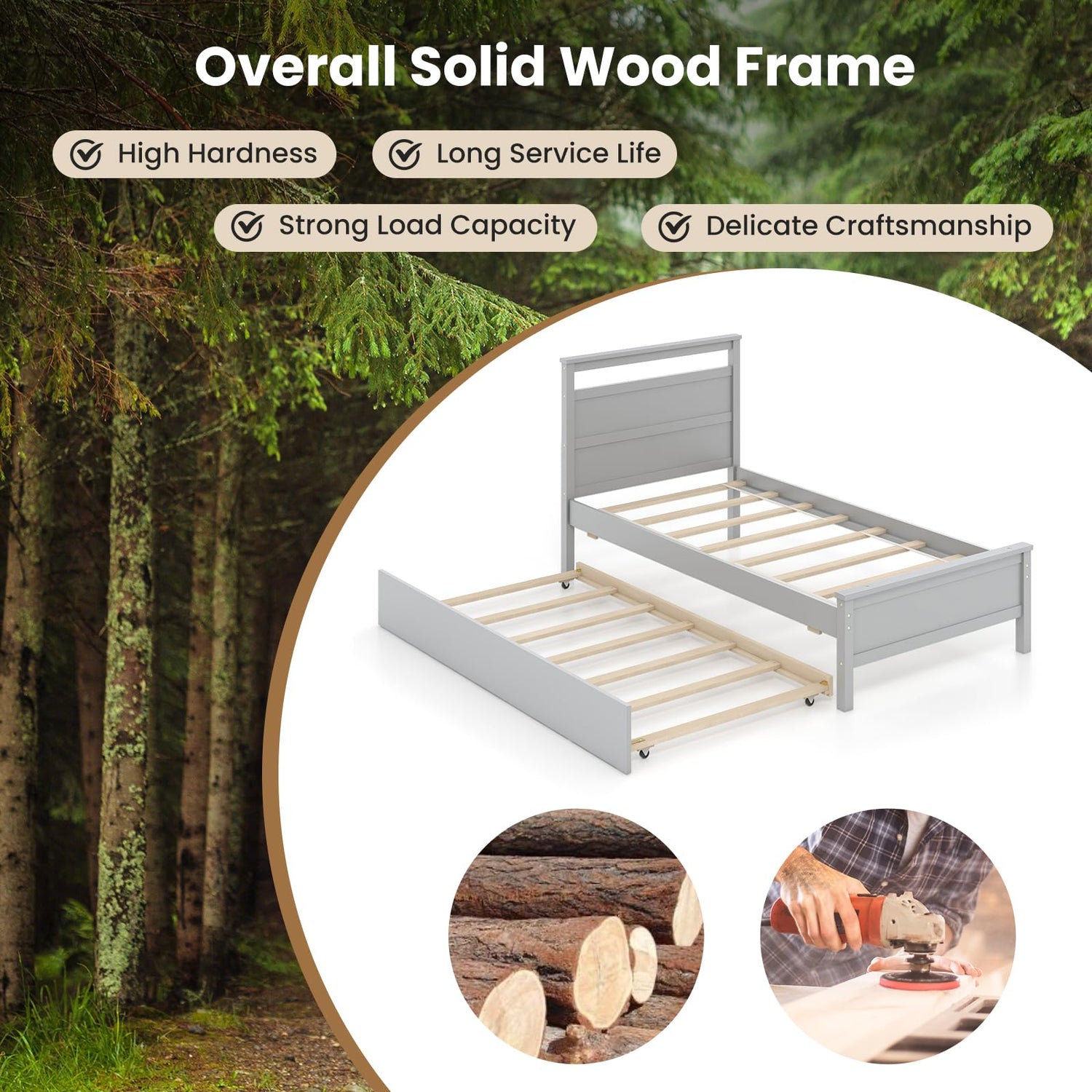 KOMFOTT Twin Bed Frame with Trundle, Wood Bed Frame with Pull-Out Trundle, Headboard & Footboard, Wooden Slat Support, No Box Spring Needed, Mattress Foundation (Grey)