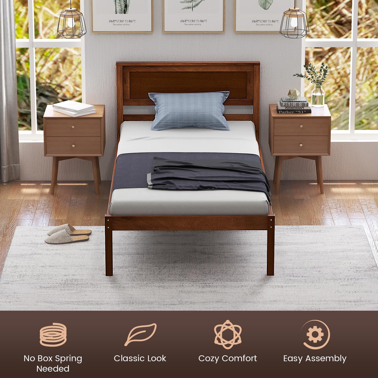 - Classic Look with Elegant Headboard: This wood bed frame features a 20.5” headboard that supports your body and give your bedroom the rustic feel. With classic look and simple concise design, this wooden platform bed can fit into any bedroom aesthetic. It will be a great choice for bedroom, guest rooms, or apartments.