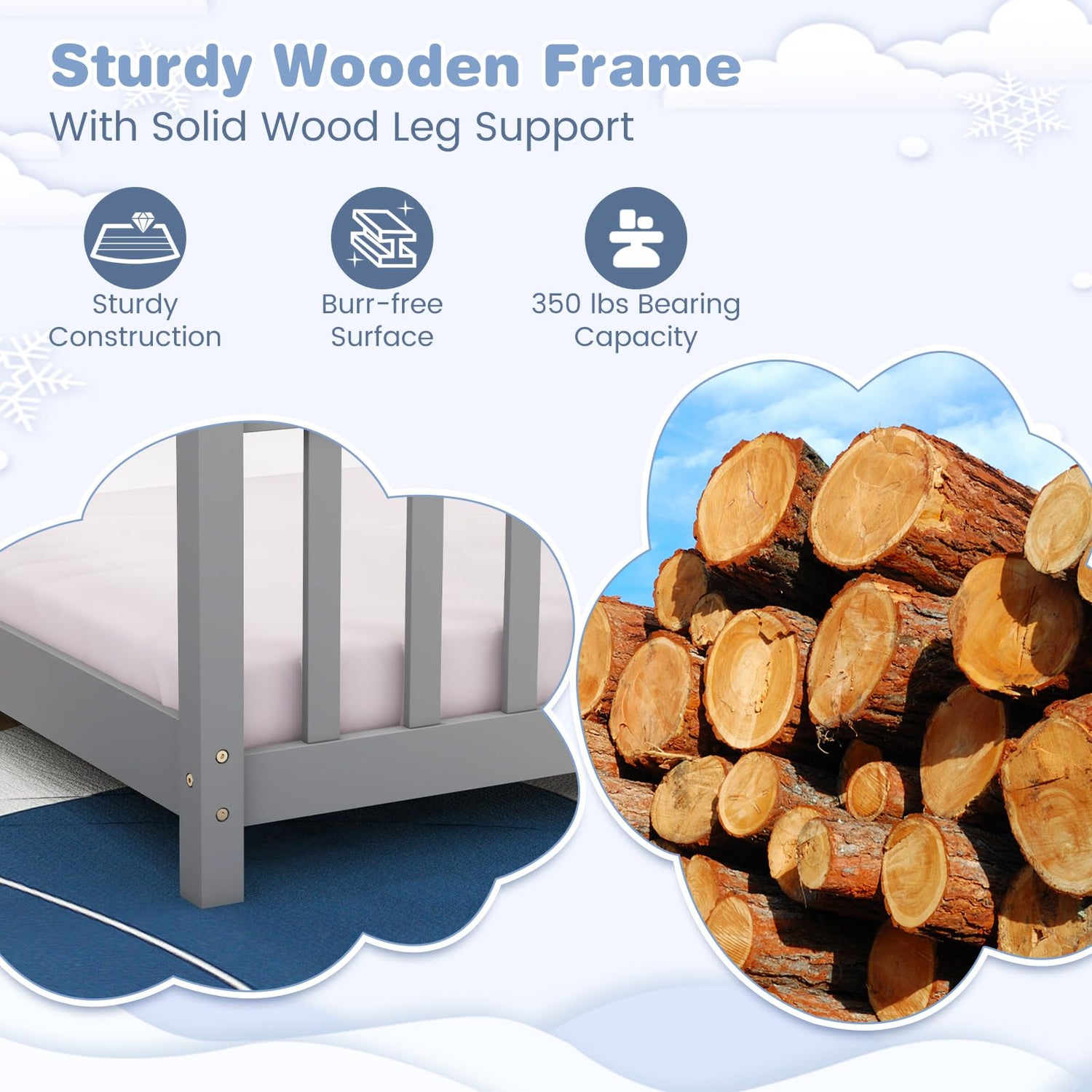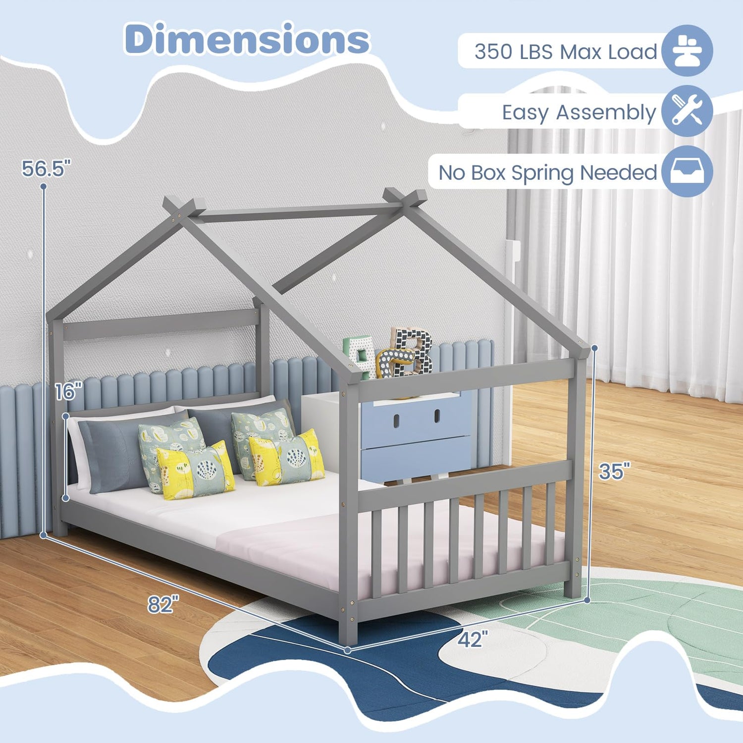 KOMFOTT Grey Twin House Bed Frame for Kids - Low Profile Montessori Tent Bed with Roof & Safety Design