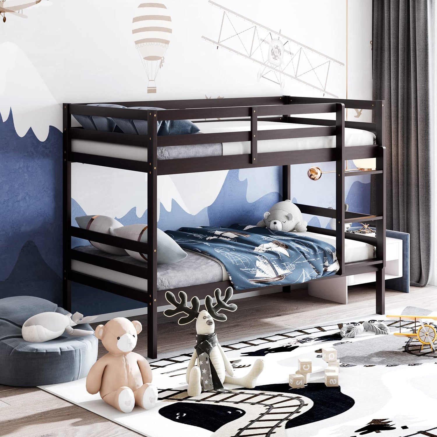 KOMFOTT Espresso Twin Over Twin Wood Bunk Bed with Ladder & Safety Guardrail