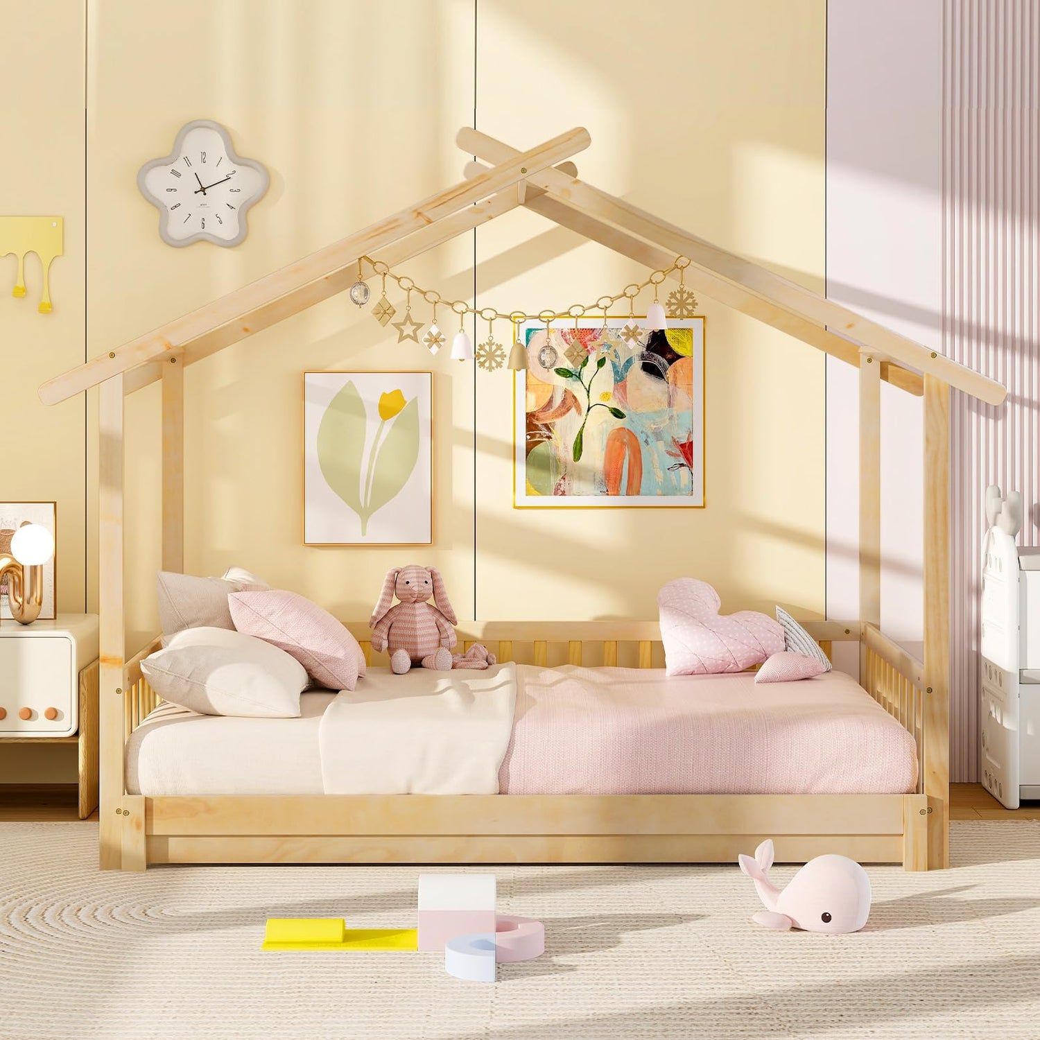 KOMFOTT Wood Extendable House Bed, Twin to King House Daybed with Safety Rails & Decorable Roof, Montessori Daybed, No Box Spring Needed, Roof-Shaped Floor Daybed for Kids, Teens (Natural)
