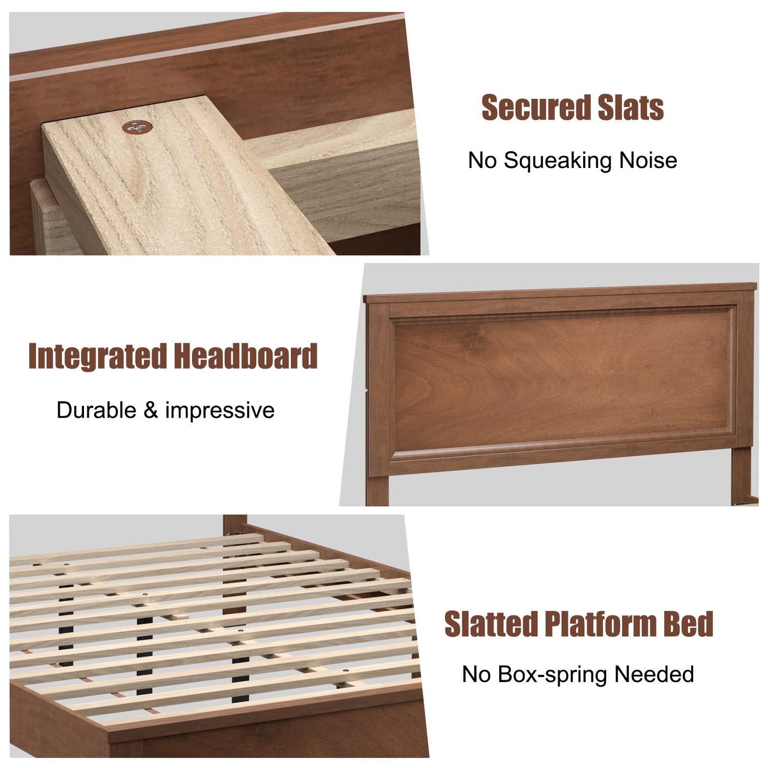 KOMFOTT Mid Century Solid Wood Full Bed Frame with Headboard & Slatted Mattress Support