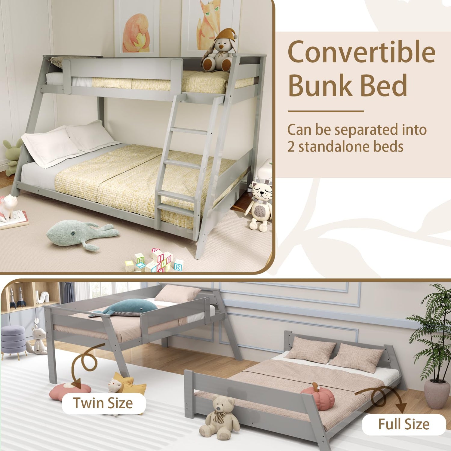 KOMFOTT Wood Twin Over Full Bunk Bed with Reversible Ladder, Wood Bunk Bed Frame with Slats Support & Safety Guardrails, Low Convertible Bunk Bed for Teens, Adults, No Box Spring Needed (Grey)
