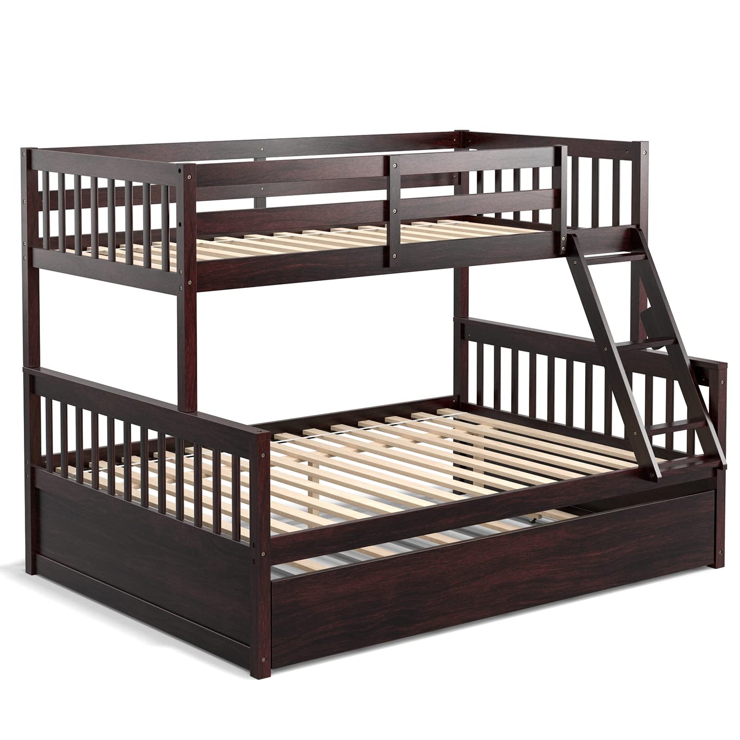 Featuring 1 twin upper bed, 1 full lower bed with a pull out trundle, this versatile bunk bed is perfect for family use or to provide extra sleeping area for overnight sleepers. The suitable mattress for the top and bottom bunks should not exceed 6" and the mattress for the trundle bed is 4"-5". The twin over full bunk bed is crafted from solid pine wood frame and many slats so that the bunk bed is sturdy and durable. These slats save you from the trouble of purchasing separate box springs. The upper bunk has guardrails to ensure safety and sweet nights. The 3-step ladder is easy to climb up and down. And, when your kids get older, don't fret! This space-saving bunk bed for small spaces can be effortlessly separated into 2 beds to meet your needs. The sleek and modern design is perfect to combine with your current home style.