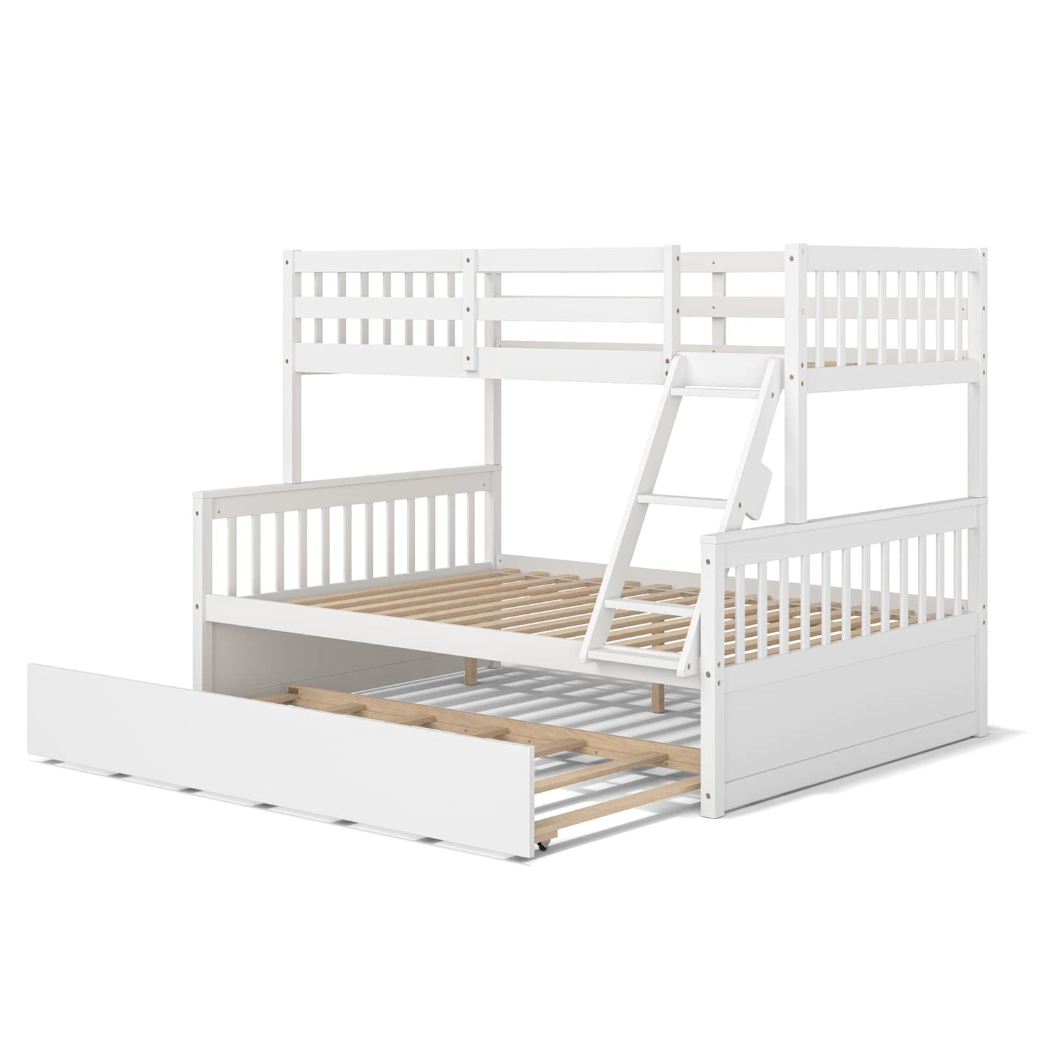 KOMFOTT Solid Pine Wood Twin Over Full Bunk Bed with Trundle and Safety Guardrails