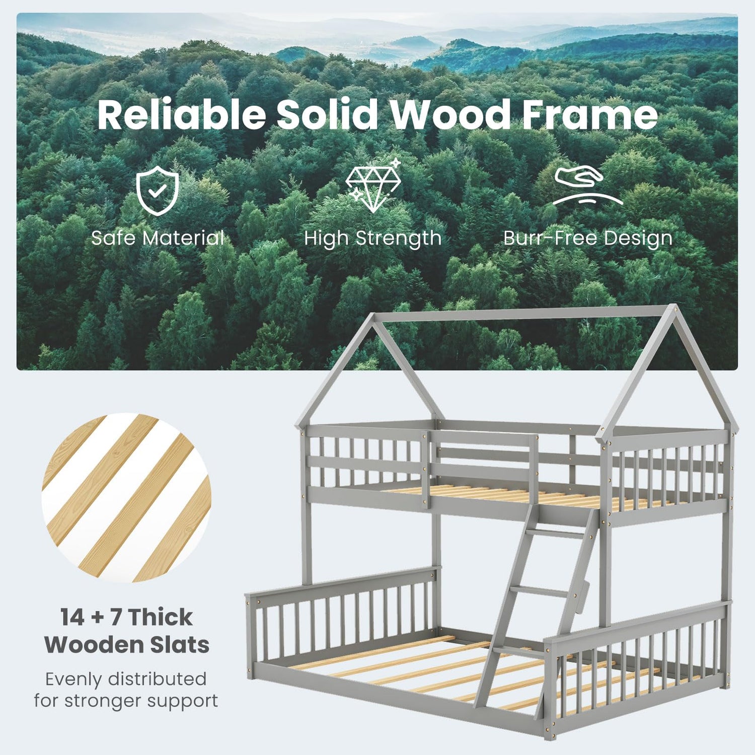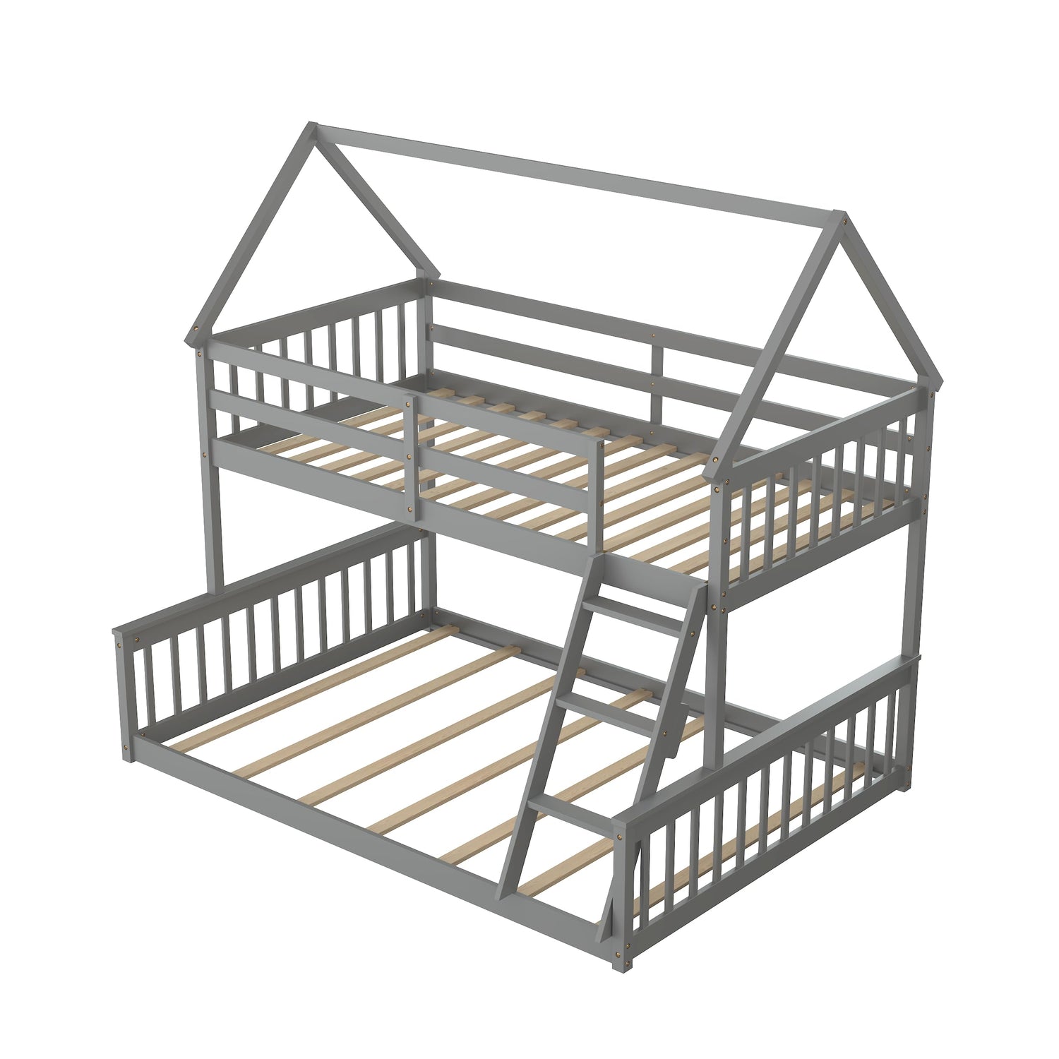KOMFOTT Grey Twin Over Full House Bunk Bed with Integrated Ladder and Safety Guardrails