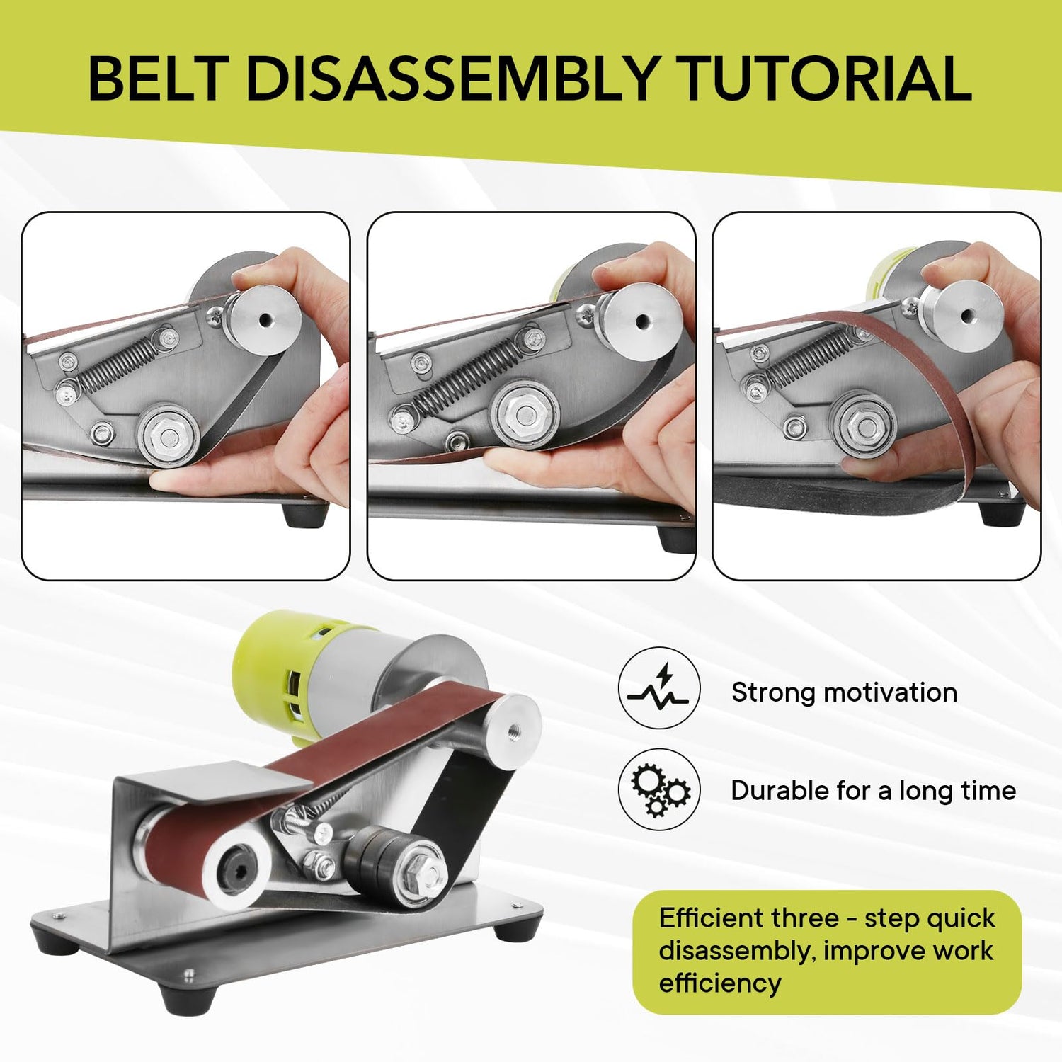 - Product Design: This belt sander is designed with a fixed 15-degree sanding belt angle and three bearings. This design is ideal for metalworking and quick belt changes