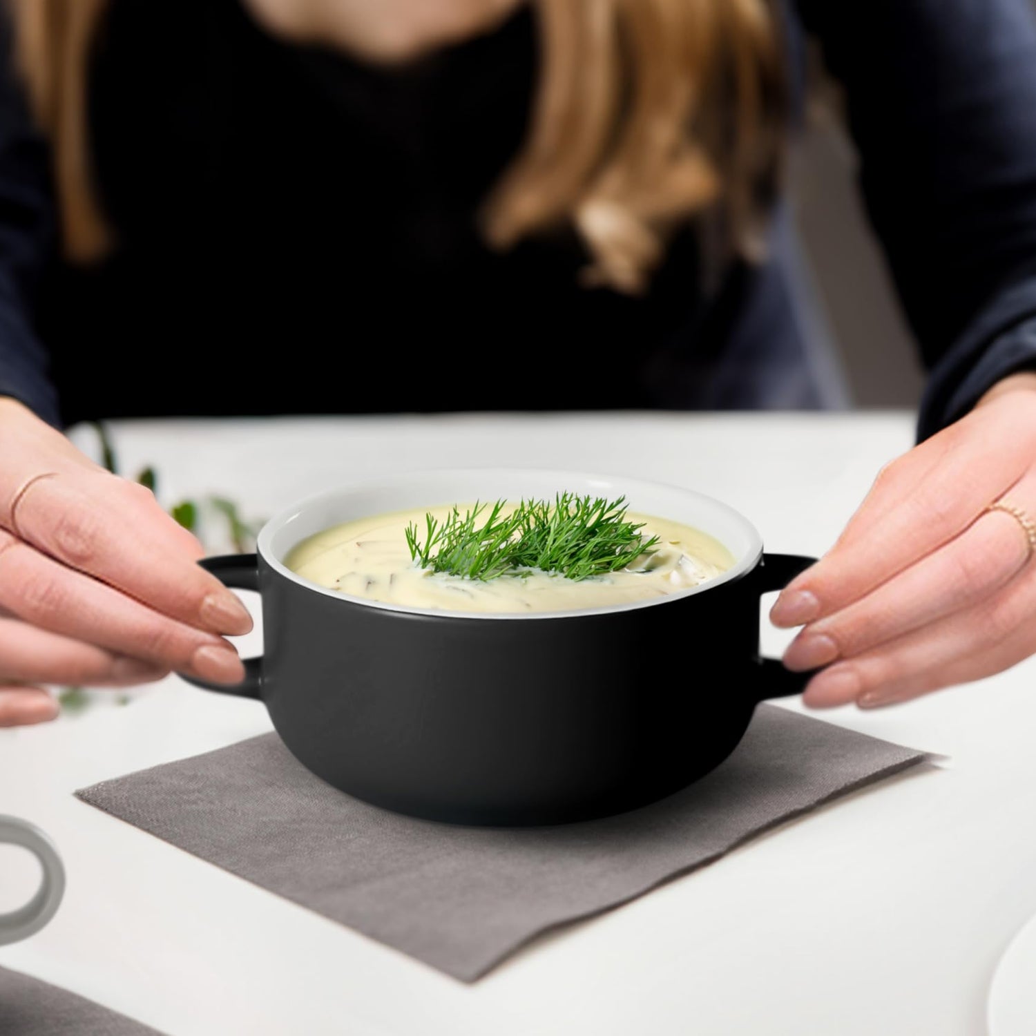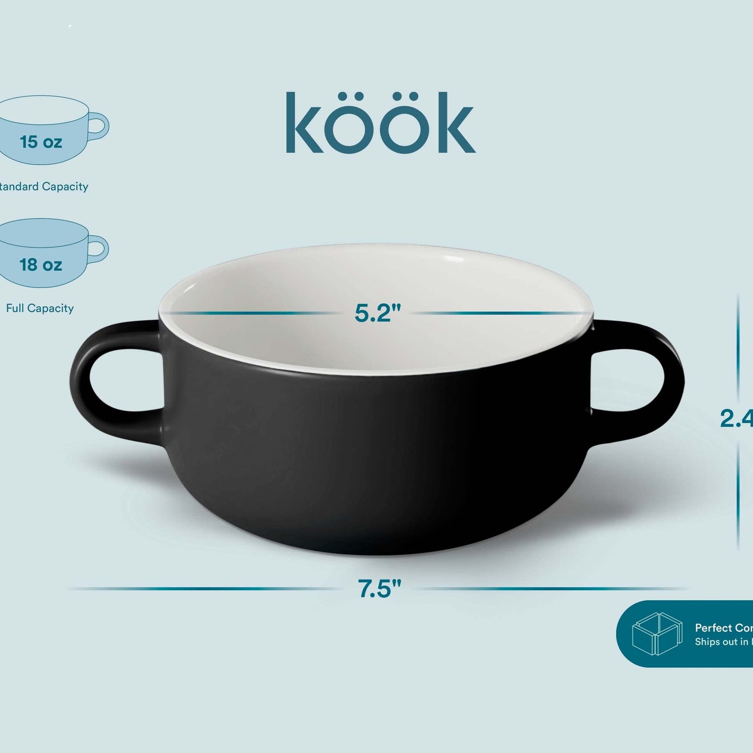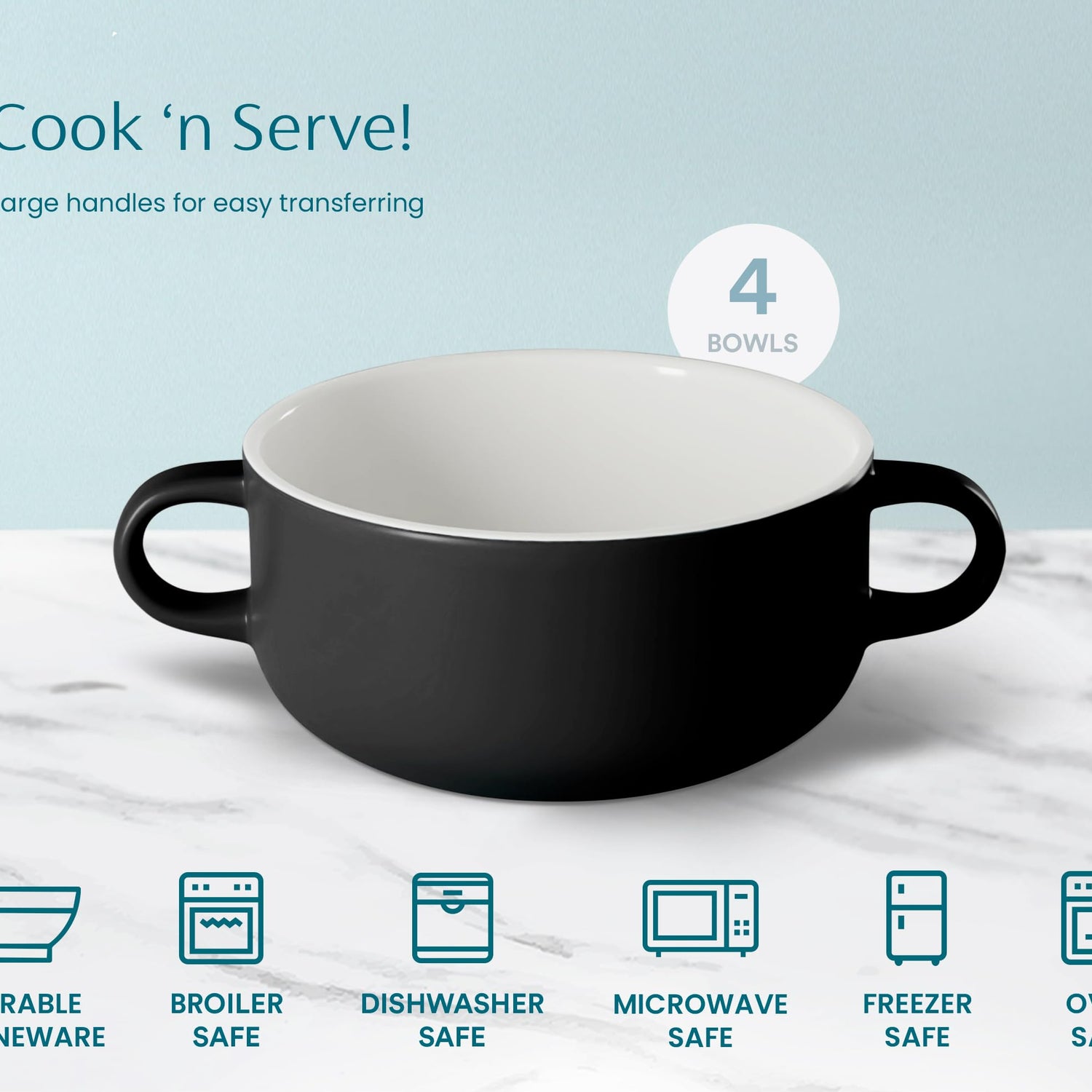 Kook Soup Crocks, Ceramic Bowls, Broil, Oven, Microwave and Dishwasher Safe, with Handles, For Casserole, Pasta, Cereal, 18 oz, Set of 4 (Black)