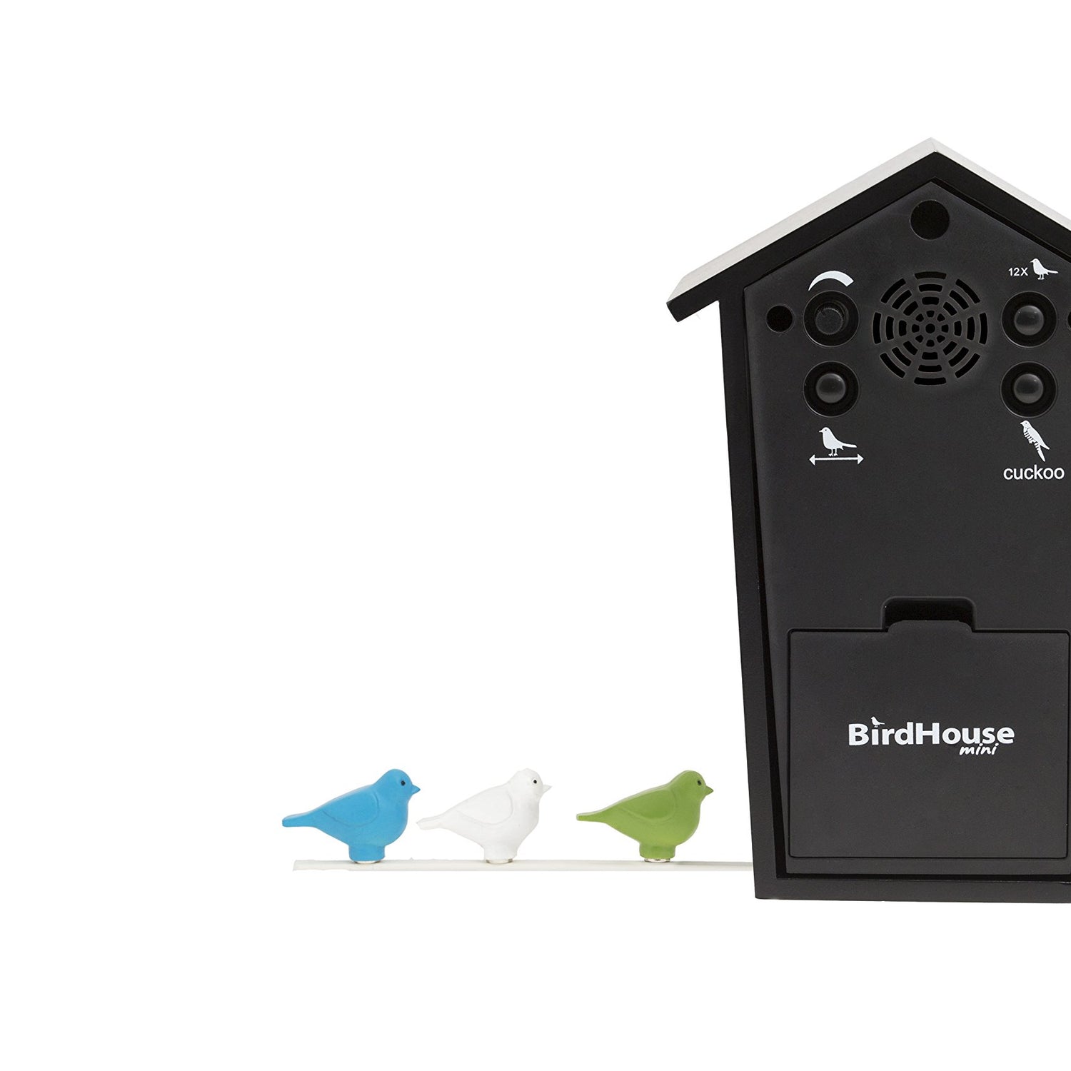 • Every hour on the hour: a chirpy songbird appears to warble its melody for that time of day. The volume is fully adjustable. A built-in light sensor ensures a silent night.