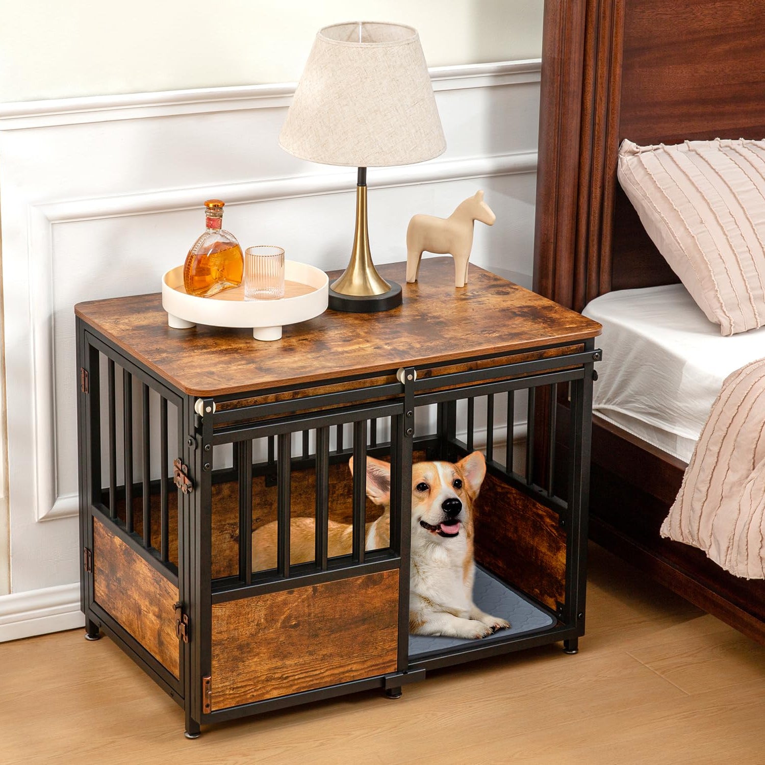 - 【Multi-Purpose Use】-- The combination of dog kennel and modern furniture makes this dog crate more than just a kennel. Dogs as our families need a private and safe space to rest. Also, it can be used as an elegant side table, end table, and nightstand in the living room and bedroom. Classic rustic vintage styles can easily match a variety of home styles.