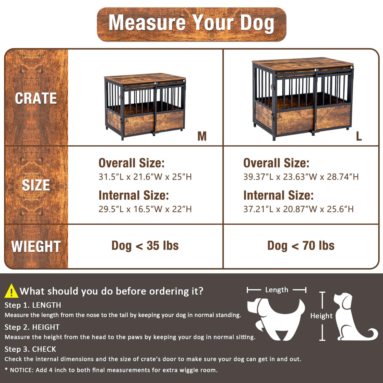 - 【Ventilation & Full View】-- The Overall Size is 32”L x 22”W x 25”H. The Internal Size is 29.5”L x 16.5”W x 22”H. This indoor large dog crate is ideal for dogs up to 35 lb. Ventilation at its personal best with a full view for the pet to enjoy some peaceful time as they can see you and you can enjoy watching them rest in style, helps a nervous puppy feel safe and relaxed.