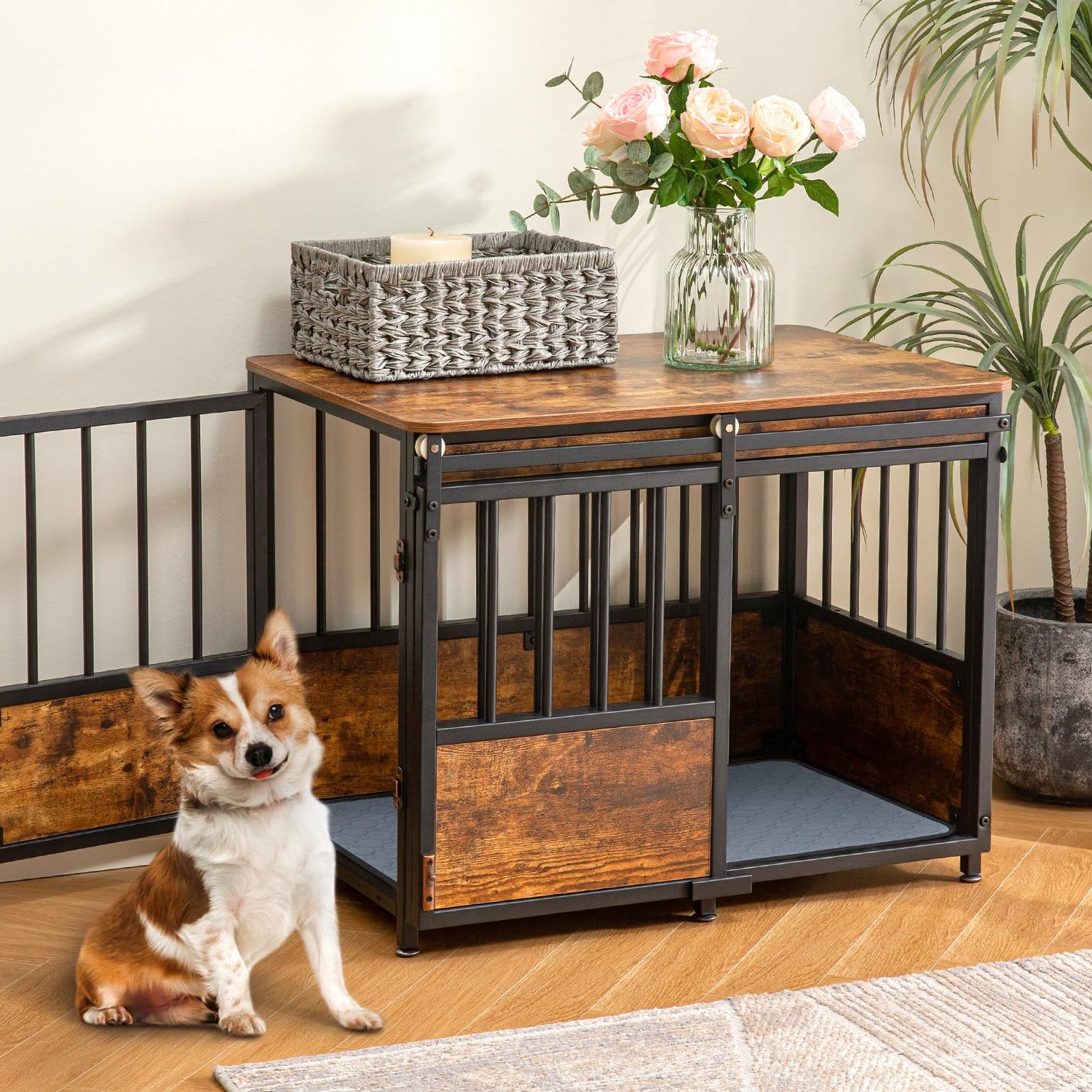 - 【Cushion Included & Two Entrances】-- KOOPRO Furniture-style dog crate contains an anti-slip pet bed to create a comfortable place for your pet dog to rest. Simultaneously, 2 entrance designs for easy accessibility and cleaning. The front of the wooden dog cage with cushion is designed with a lockable sliding door, which looks modern elegant and saves space.