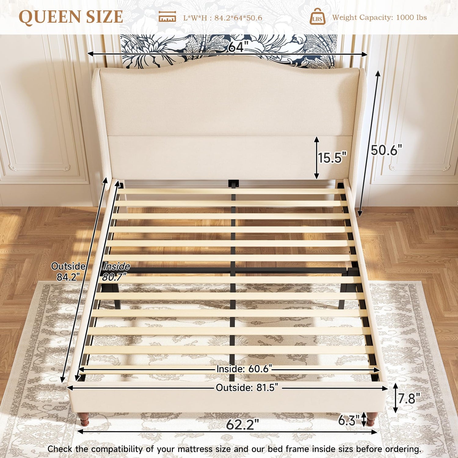 koorlian Queen Size Bed Frame Upholstered Platform Bed with 51" Tall Headboard Wingback, Soft Fabric, Retro Simple Style Platform Bed No Box Spring Needed, Easy Assembly, Beige