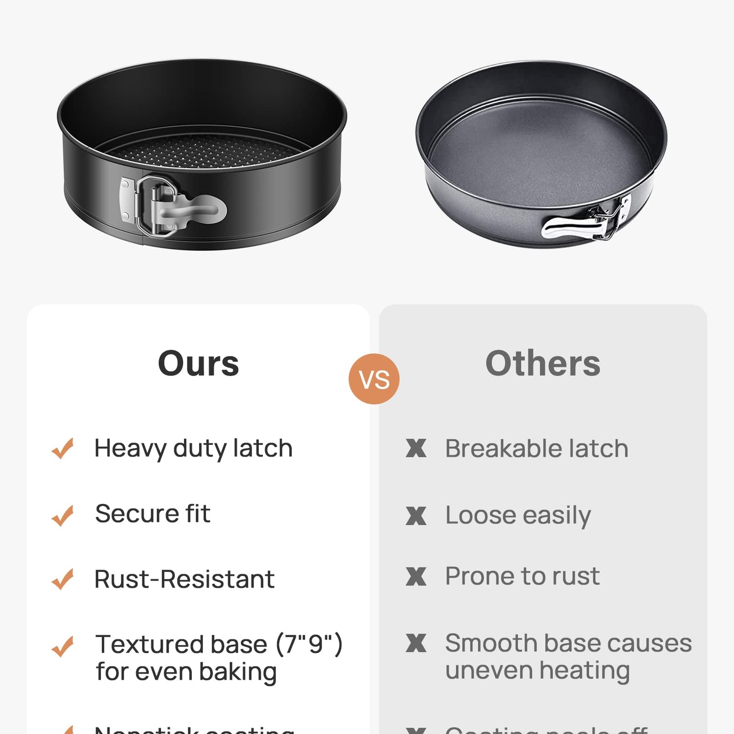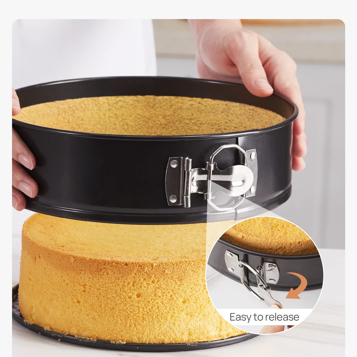 - Easy Release Baking Pans: Each springform pan consists of two parts with a detachable bottom and a 3-inch high surround. This design proves helpful when baking delicate cakes like flourless chocolate cake or cheesecake. After baking, simply release the latch on the surround and lift it upwards to easily retrieve the cake without the need to invert it, thereby maintaining the cake's integrity.