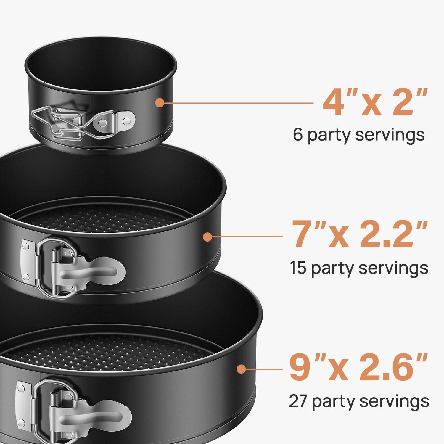 - 3 Round Cake Pans: Comes with three circle cake pans of varied sizes (4", 7", and 9"), offering convenient options based on serving sizes. The 9-inch pan is suitable for creating large cake bases for family celebrations, while there are also 4-inch and 7-inch cheesecake pans available. This variety allows you to bake an array of treats, such as cheesecakes, pizzas, quiches, ice-cream cakes, lasagnas, and more.